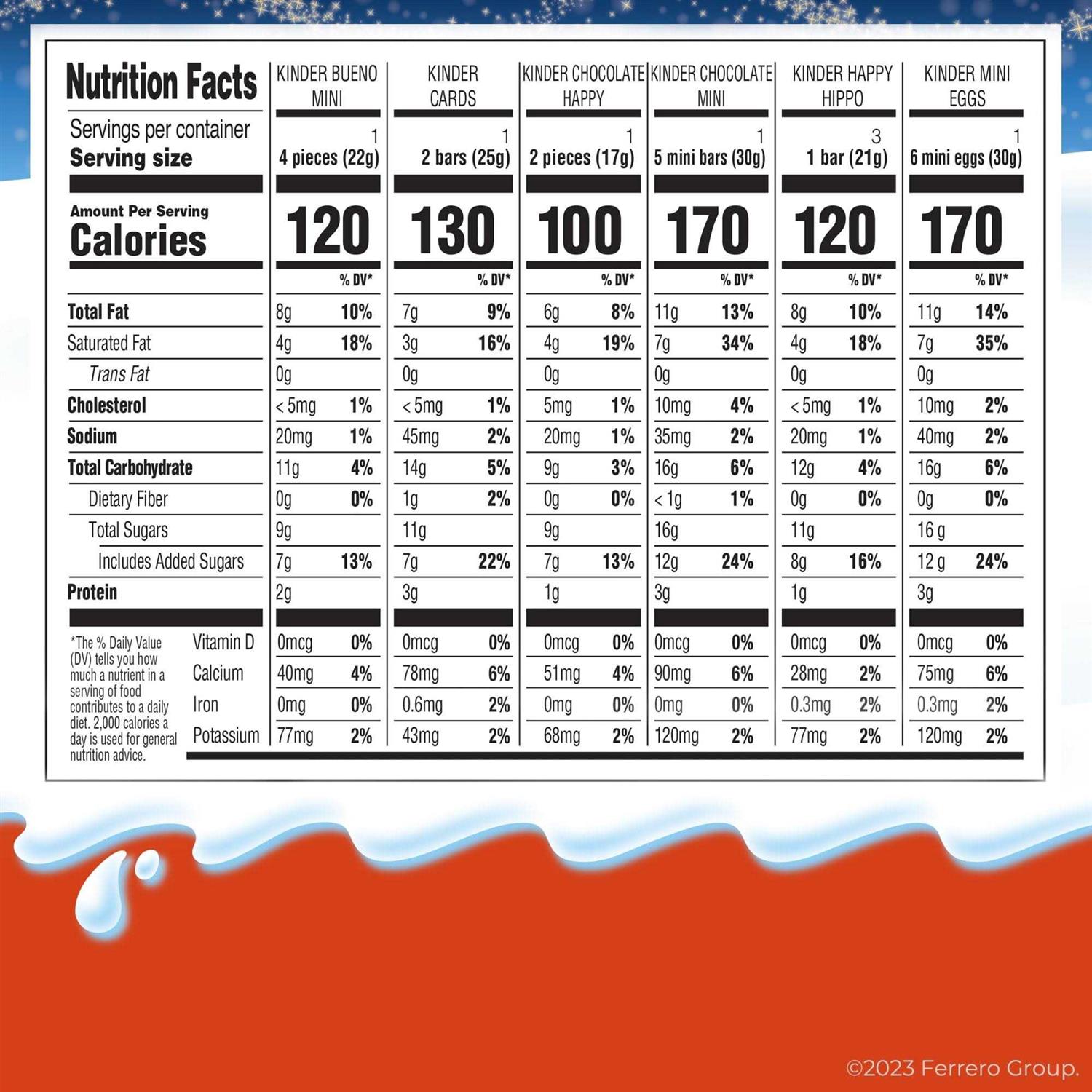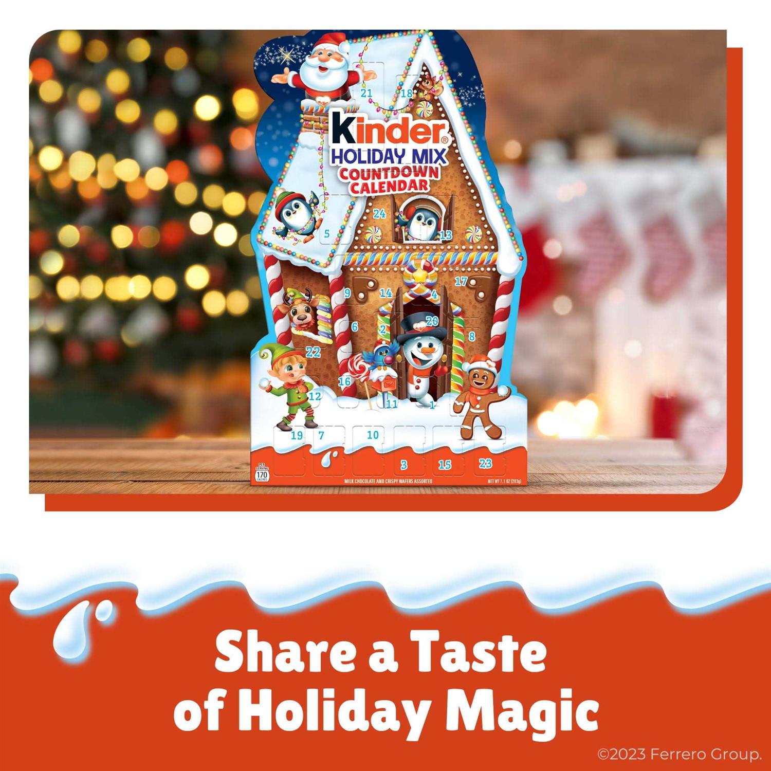 Assortment Boxes by Kinder Joy. Details:Count down to the holidays with an assortment of 24 delicious Kinder holiday chocolates. A great holiday gift, the 2023 Kinder Holiday Mix Countdown Calendar is filled with Kinder Happy Hippo, Kinder Bueno Mini, Kinder Chocolate Mini, Kinder Cards and Kinder Chocolate Mini Eggs. Have an enjoyable countdown ’til the holiday with a sweet treat every day in December. This advent calendar for kids will bring the joy of the season to life. Parents will love Kinder Seasonal because there are no artificial colors or preservatives used. Kinder seasonal treats are made to make any occasion more magical no matter what time of year by celebrating childhood with delicious treats the whole family will love.