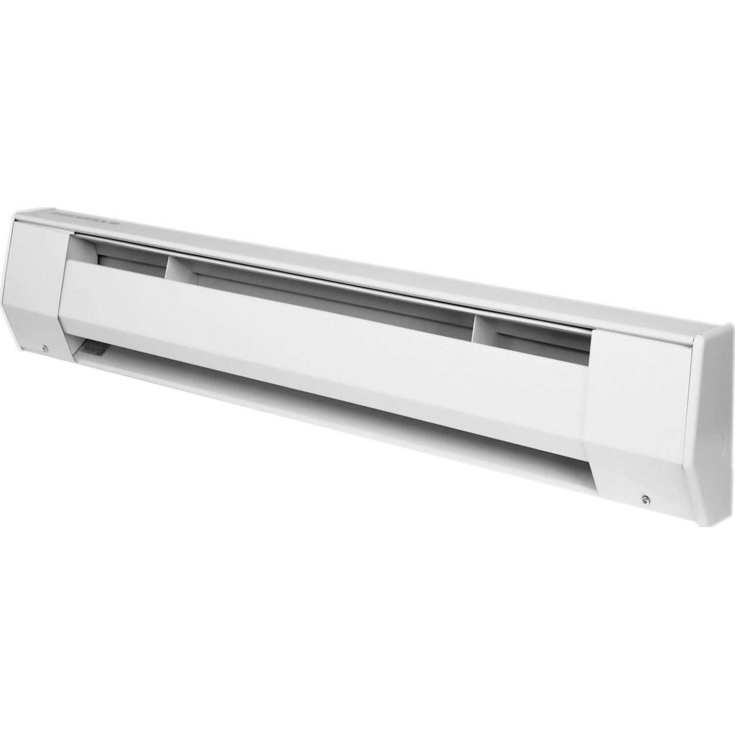 Standard electric baseboard heater uses convection heat to efficiently warm spaces up to 125-sq ft. 1250 W of power at 120 V provides 4266. 25-BTU of steady even heat to eliminate the chill from your bedroom living room or other high areas. 60-in L sleek design fits perfectly beneath windows taking in room air from the bottom and releasing heated air through the top. Bright white steel construction features a crush-proof aluminum element to ensure durability. Paintable design means you can match the heater to your room or add a bold accent.