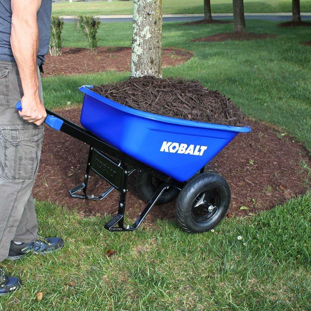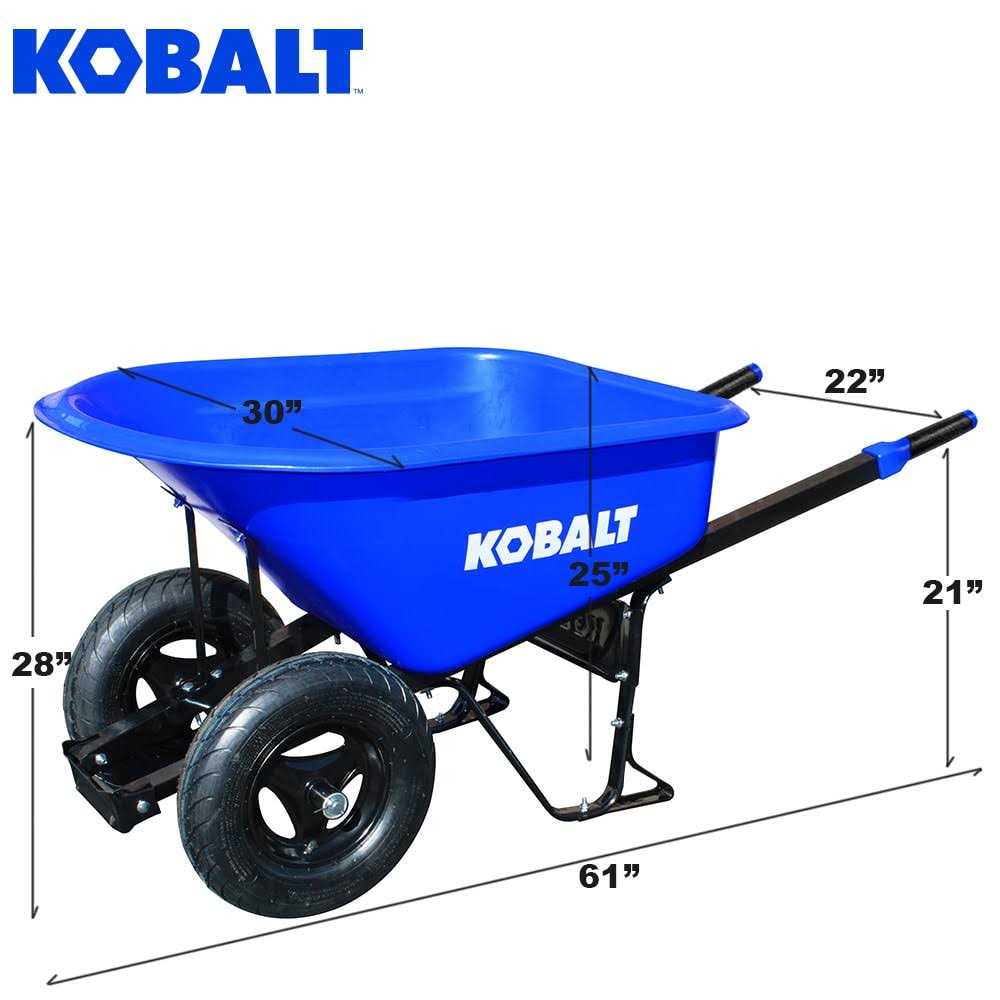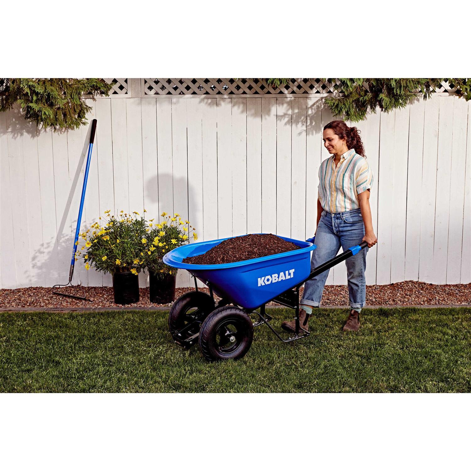 The Kobalt 7 CF thermo form wheelbarrow is made using the highest quality high-density poly materials. The thermo form (vacuum forming) process creates a tray that is significantly more durable and practical than a traditional injected molded tray while also being lighter than any steel wheelbarrow tray. When combined with the upgraded undercarriage, steel handles and dual pneumatic tires you have a workhorse of a unit built for the professional and perfect for the homeowner. No matter the task, this Kobalt wheelbarrow will be there start to finish and for years to come.