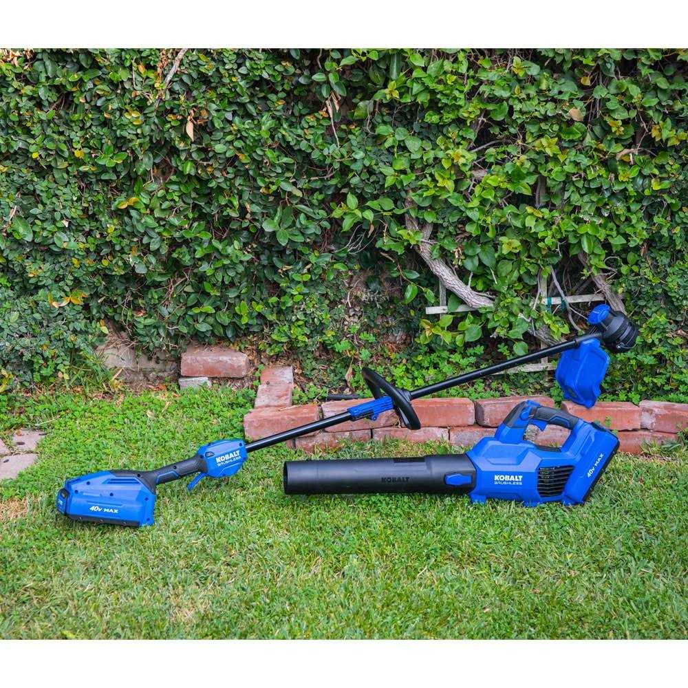 The Kobalt 40-Volt Max Leaf Blower and String Trimmer Combo Kit helps keep you tackle all your yard projects. The string trimmer’s 15 inch cutting swath and dual line feed increase cutting efficiency, while it’s dual bump head makes it easy to advance line for continuous use. The leaf blower’s turbine fan produces 520 CFM to quickly remove debris so you don’t have to rake, and it’s removable tube makes storage convenient. Variable-speed triggers on both tools allow you to set the power to suit the task for maximum control. The included 4.0 Ah battery and charger are compatible with all Kobalt 40-volt max tools. Brushless motors offer increased power, longer run time and prolonged motor life Blower -Brushless motor produces up to 520 CFM air volume Blower – Brushless motor produces 120 MPH air speed for easy debris removal Blower and String Trimmer offer Variable-speed trigger for precise control Trimmer – Rapid-reload head for quick and easy line replacement Trimmer – 2 speed options for greater control AWP: FOR THE LEAF BLOWER,Turbo Button for Maximum Performance Compatible with the Kobalt 40V Family of 45+ Outdoor Tools