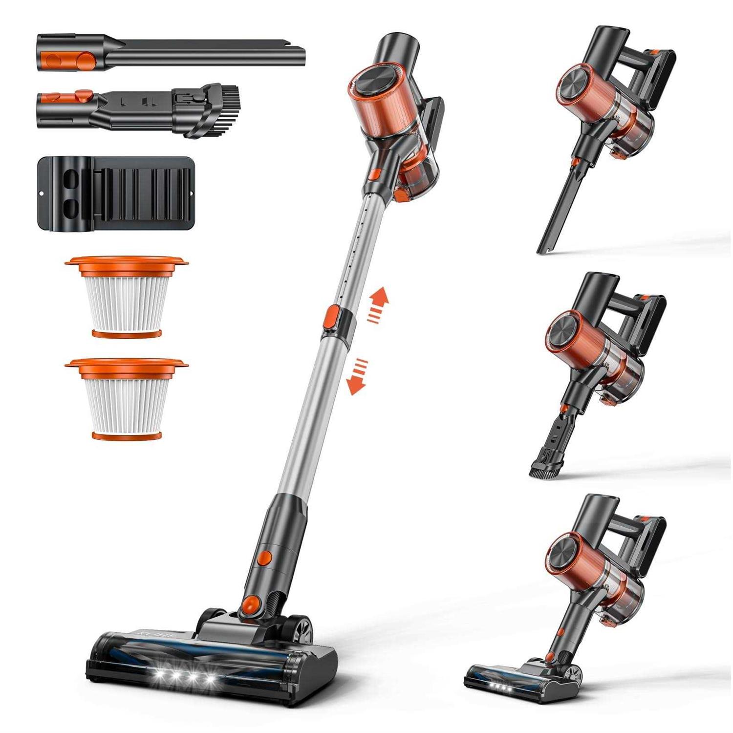 【Up to 20-45 Mins Runtime】 KOHE cordless stick vacuum cleaner offers an impressive runtime of up to 45 minutes, ensuring thorough cleaning for houses of up to 1600 sq ft. It is powered by 6 x 2200 large-capacity rechargeable batteries, providing exceptional cleaning performance. In Low Mode, you can enjoy a continuous 45-minute cleaning session, while in MAX Mode, the runtime is up to 20 minutes 【6-layer high-efficiency filtration system】 Cutting-edge cordless vacuum cleaner equipped with a 6-layer high-efficiency filtration system. This advanced filtration technology ensures that even the finest dust particles and allergens are effectively trapped and prevented from being released back into the air. The result is a cleaner, healthier home environment for you and your family. 【23kpa 200w Powerful Suction Power】experience the Power of KOHE Cordless Vacuum Cleaner, Equipped With a 200w Upgrade Motor That Delivers Strong 23kpa Suction in Max Mode.V10 Cordless Stick Vacuum Excels in Cleaning All Kinds of Hard Floors and Short-pile Carpet. Shift Between Two Suction Modes to Tackle Various Cleaning Tasks, from Dust and Pet Hair to Debris on Hard Floors, Carpets, Stairs, and Cars. 【LED Display & LED Rotatable Brush Head】LED display design of this stick vacuum cleaner makes you effortlessly know the status of the hardwood floor vacuum. It shows the battery level, suction power mode. 4 bright LED lights help the stick vacuum cordless illuminate every dark area and track dust and dirt. The brush head can be rotated by 90°/180°, with no dead end in corners and under furniture. Bring ease and convenience to your cleaning work! 【Adjustable Suction Power & Versatile】: The vacuum cordless supports 2 adjustable suction power. Equipped with retractable tube and versatile attachments to adapt different cleaning places from floor to ceilings. The vacuum cleaner cordless can be switched into a handheld vacuum cordless easily to clean your sofa, stairs, or other upholstered furniture. KOHES Cordless Vacuum Cleaner, 23Kpa Powerful Suction Lightweight Stick Vacuum with LED Display, 6 in1 Handheld Vacuum with 45 Min Runtime Detachable Battery for Home Car Hard Floor Carpet Pet Hair