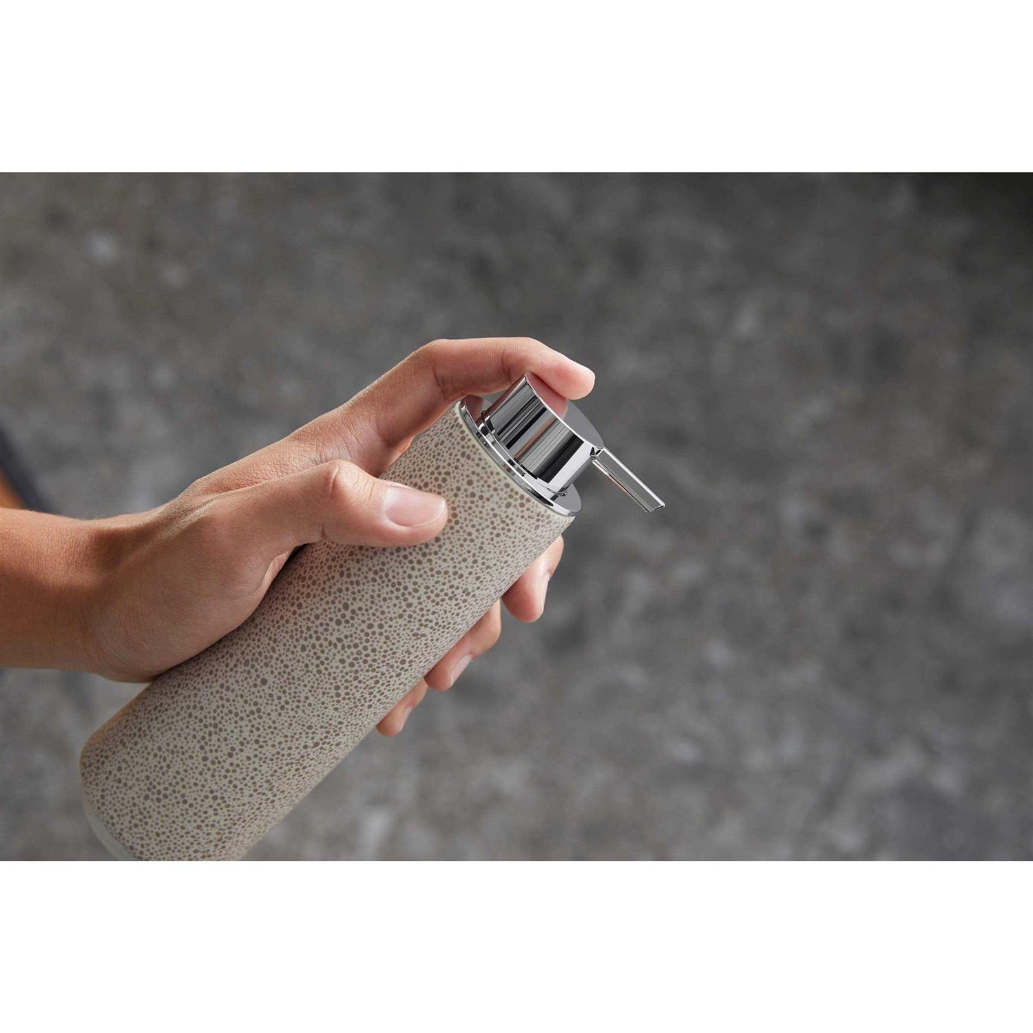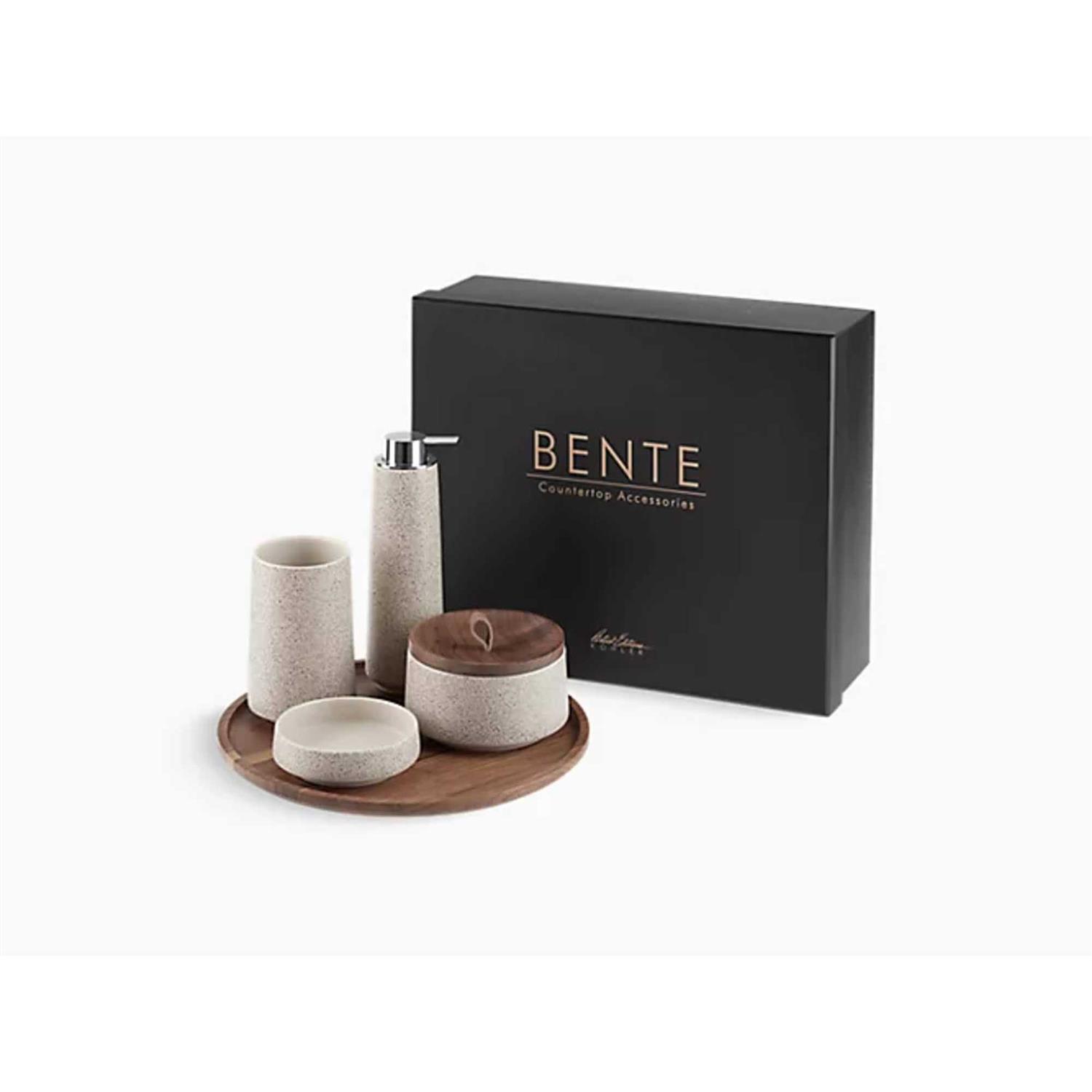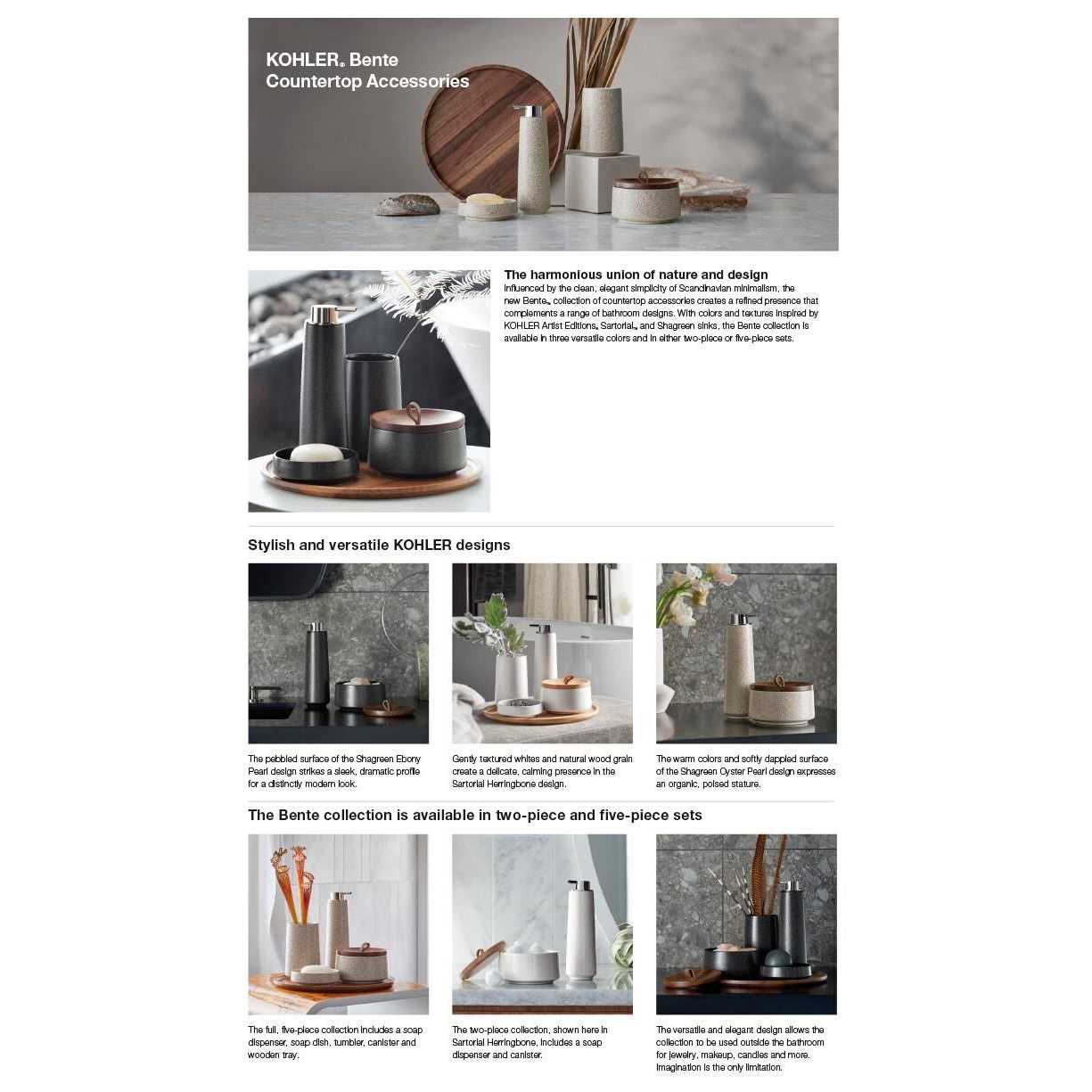 Kohler This five-piece set includes a ceramic soap dispenser, tumbler, lidded canister, soap dish, and a wooden tray. Each piece was thoughtfully designed to nest together on the wooden tray or be used individually in a multitude of spaces throughout the home. Unique material elements and finishes are beautifully incorporated into the collection. The pattern celebrates the subtle colouring and distinctive pebbled texture of natural shark and ray leather.