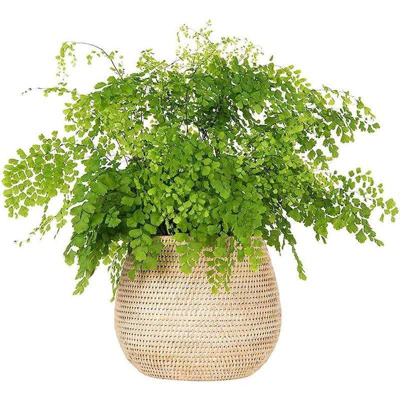 Overall diameter 10 inches x 8.5 inches high. Diameter opening 7 inches. Hand crafted fom naturally grown Rattan. Holds 6 inch pot Cleans with damp cloth.