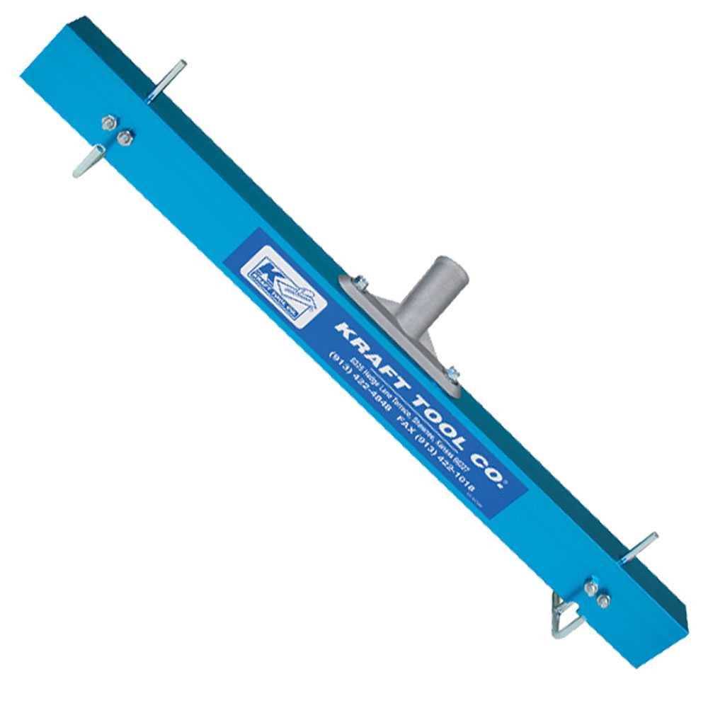 The 24″ Gauge Rake allows for a uniform coating of surface with self-leveling and other materials. The aluminum rake is sturdy enough to move lots of material, yet lightweight for long hours spent moving material. Two adjustable plated steel T-Skates attach to the rake and can be moved up and down to the desired depth of material for uniform coatings. The easy to assemble rake includes all of the hardware to get started. Sturdy aluminum bracket takes broom threaded handles, sold separately. Proudly made in the USA. Kraft Tool Co. has been an American manufacturer of quality hand tools for the concrete, masonry, asphalt, plaster, drywall, tile, floor covering, and leveling trades for over 40 years.