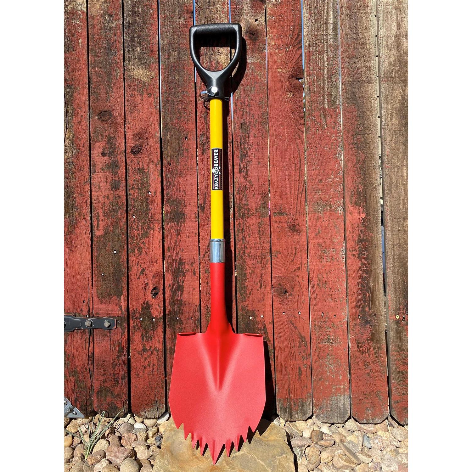 The “Krazy Beaver Shovel” is Made in the USA! Measures 40 inches Total length. Excellent for Camping, Hunting and Off-Road use. The Head: Powder coating used is Cardinal textured red. The great thing about this color is aerosol paint can be ordered to match the color in the event the shovel is used and the powder is scraped off. (Paint cans to be offered soon through Krazy Beaver Tools). Manufactured using Heavy Duty 13 gauge heat treated tempered steel. Twice as thick as a normal residential shovel. Reinforced teeth to prevent bending and breaking. Powder coated both inside and out from the head to handle area to prevent rust. The “Krazy Beaver Super Shovel” can be used for regular digging and in extreme situations can be used to assist in penetrating Ice and Clay. The “Krazy Beaver Super Shovel” is only available in red at this time. Measures 11 1/2” Height X 8 1/2 wide. The Handle: Made of lightweight but extremely strong fiberglass Handle is yellow for high visibility The head to handle connection has a permanently mounted solid 12” fiberglass reinforcing core to withstand breakage during the most extreme circumstances. At the end of the handle under the “D-Grip”, there is a hollow section that can be used for storage of emergency items such as matches, flint, hooks, fishing line, batteries, etc… The D-Grip: Made of solid Polymer. There is no soft rubber on these grips. The reason for the use of the solid Polymer is because soft rubber overtime begins to break down and becomes sticky. The Lock Pins: These Tab Lock Pins are awesome! Unlike regular PTO or quick release pins, you can actually use gloves. The “Tab” makes it easy to attach or remove from the shovel. In addition to being easy to use, these pins are easy to find when accidentally dropped in the sand or mud, unlike a two piece pin that has a separate pin and wire.