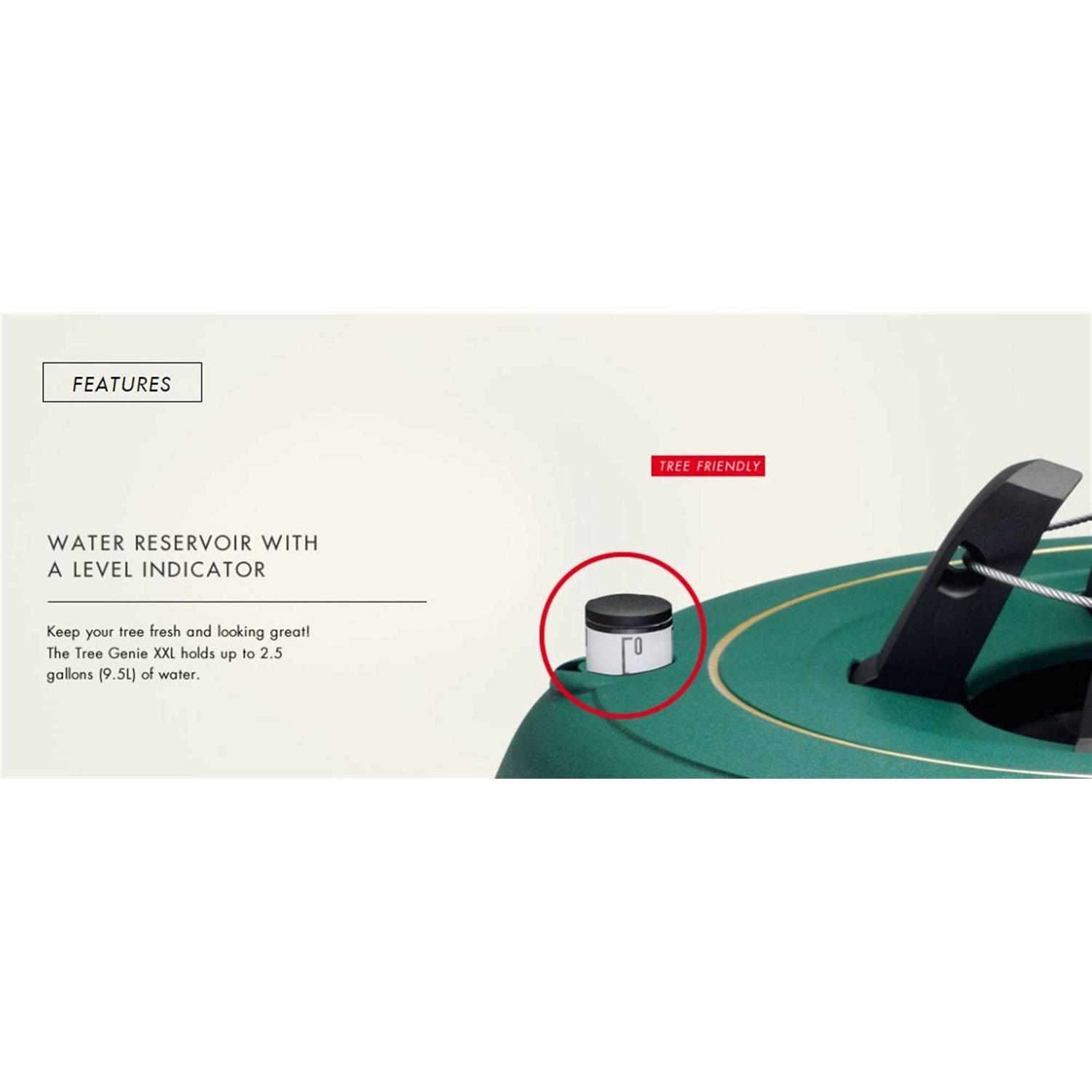 Single cable operation guarantees equal claw pressure around the base of the trunk. This device ensures a firm and straight standing no matter the size/shape of the trunk. No need to tighten screws or use additional tools! Simply place your tree in the open stand, pump the foot pedal until the bell ‘dings’ to alert you that the 5 claws perfectly grabbed the tree trunk and the pedal is locked in place! With the Tree Genie XXL your tree can be comfortably adjusted at any time, no additional helping hands needed. Keep your tree fresh with the Water Reservoir feature! The reservoir can hold up to 2.5 gallons (9.5L) of water at a time. Be careful to not overfill the tank, and make sure to stop before the water indicators’ red zone is fully visible. The dimensions of the Tree Genie XXL measure 20″ in diameter, 4.3″ in height, and 18lbs in weight. A tree measuring 12 feet with a 7″ diameter trunk is the maximum height this stand can maintain.