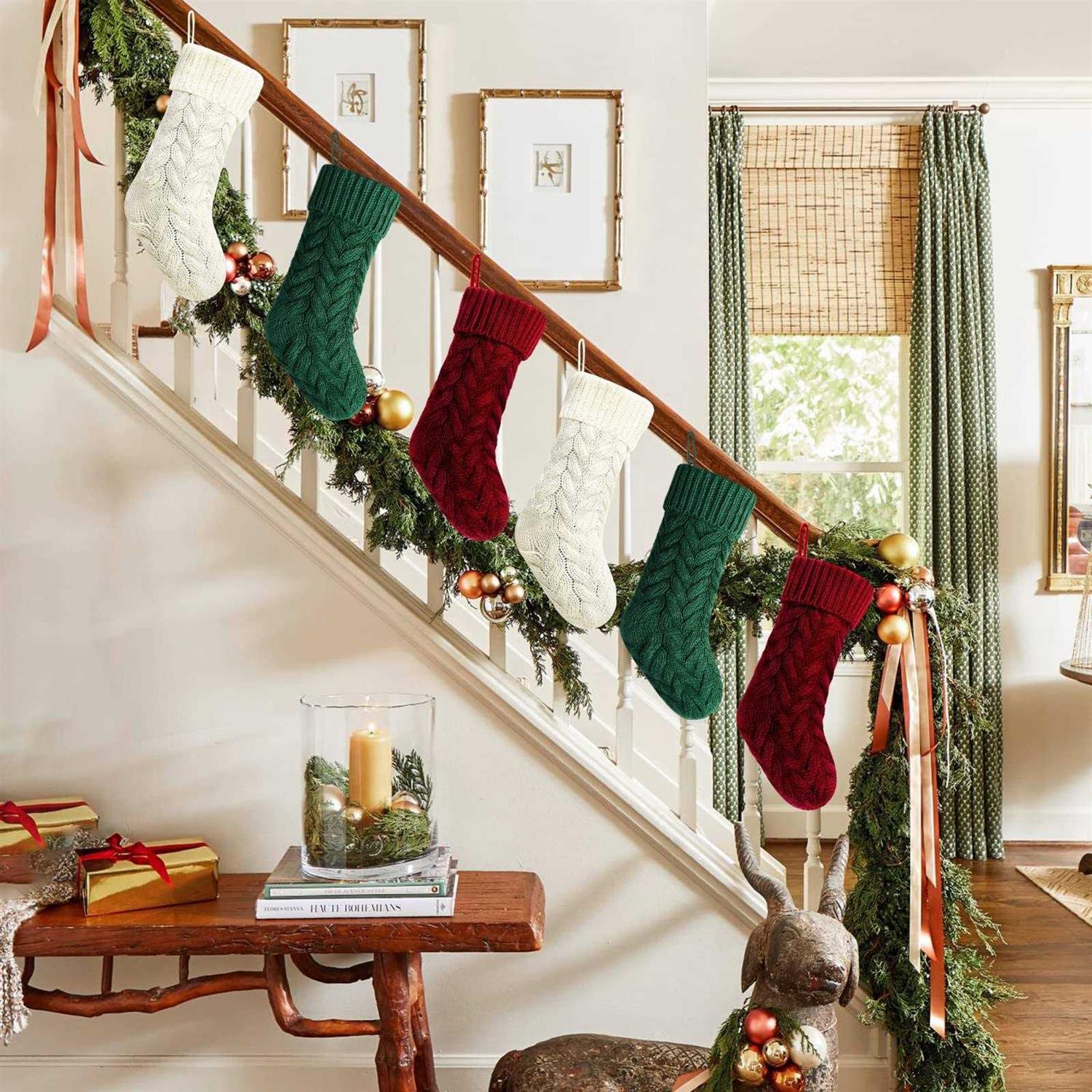 14″ long,width:5″. The length is shorter than standard size,so the stocking will remain the shape and hold little gift well. The knitted patterns are place in BOTH SIDE,you can hang it from left to right OR from right to left For decor or small gift,for you to fill candies or chocolates,watch,folding wallet,ties,gift cards,small toy cars,etc. 6 value rustic knitted Christmas stockings included 2 burgundy, 2 green,2 ivory knitted Christmas stockings. Ready to hang on stocking hangers on fireplace mantel.Handmade style to create beautiful holiday memories for generations to come! Makes the perfect Gift for family and friends.Great addition to holiday season decorations. Specifications: /b br Size:14 inches *5 inches br Color: Burgundy,green and ivory br Material:Heavy woolen yarn br Package Includes: br 6 x 14″ heavy yarn stockings,included 2pack burgundy,2pack ivory,2pack green Christmas stockings br br Features: /b br 1. Classic rustic cable knitted Christmas stockings. br 2. Made by thick heavy woolen knitted yarn giving you an old fashion Christmas and cozy feeling. br 3.14″Christmas stockings for small gifts or decor,for you to fill candies or chocolates,watch,folding wallet,ties,gift cards,small toy cars,etc. br 4. Ready to stuffed and hang on stocking hangers or mantle clips on fireplace mantel. Handmade style to create beautiful holiday memories for generations to come! Makes the perfect gift for family and friends.Great addition to holiday season decorations. br br Recommendation: /b br 1. Custom monogram stockings by embroidering name on the top of the Christmas stockings. Making unique Christmas stockings. br 2. Great addition to Christmas decorations. Also a nice present for your family and friends. br 3. Charming when hanging on the mantel or stairs br 4. The knitted patterns are place in BOTH SIDE,you can hang it from left to right or from right to left to make your own unique Christmas decoration. br br