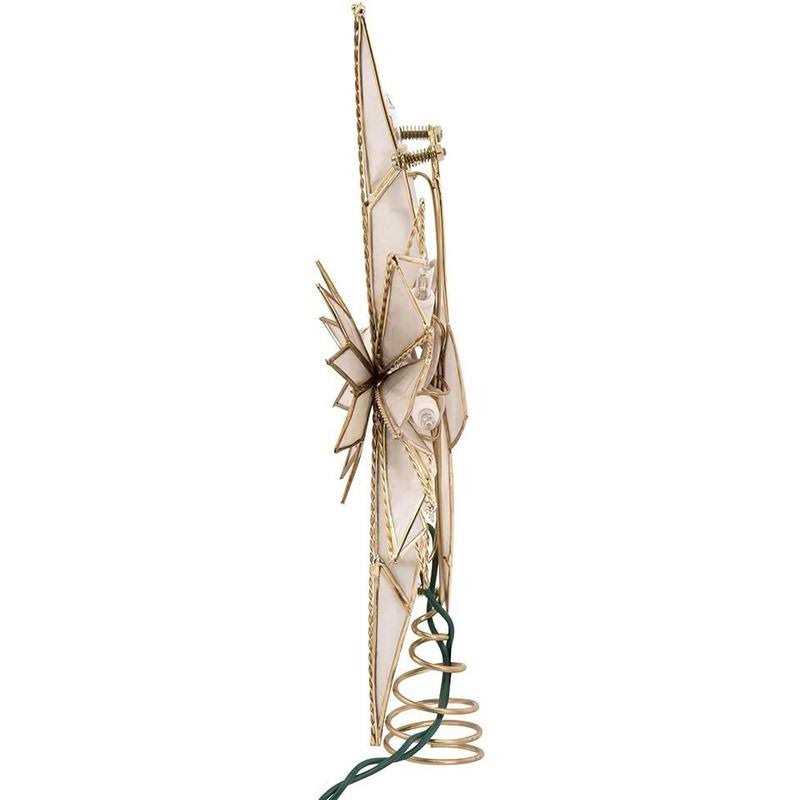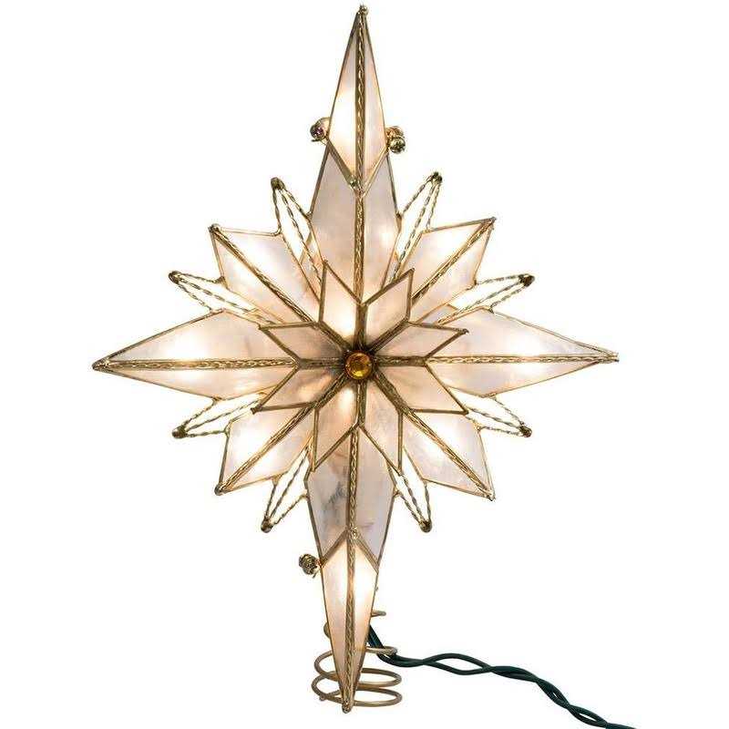 This 10-light 10-inch capiz classical multi-pointed Bethlehem star treetop features twisted wireworks and a glass gem centerpiece in natural color brass finish. This treetop includes 5′ lead wire and 4 spare bulbs.