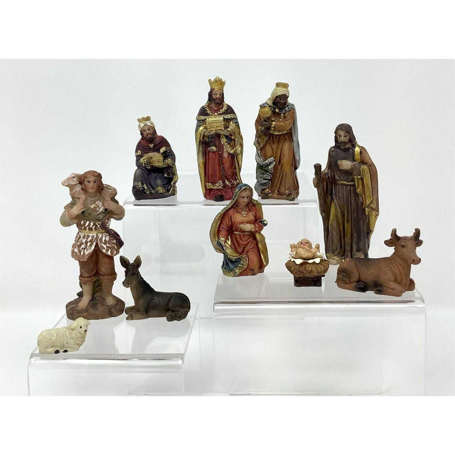 - Nativity set includes Baby Jesus, Mary, Joseph, the Three Wise Men, a shepherd, a cow, a donkey, and a lamb