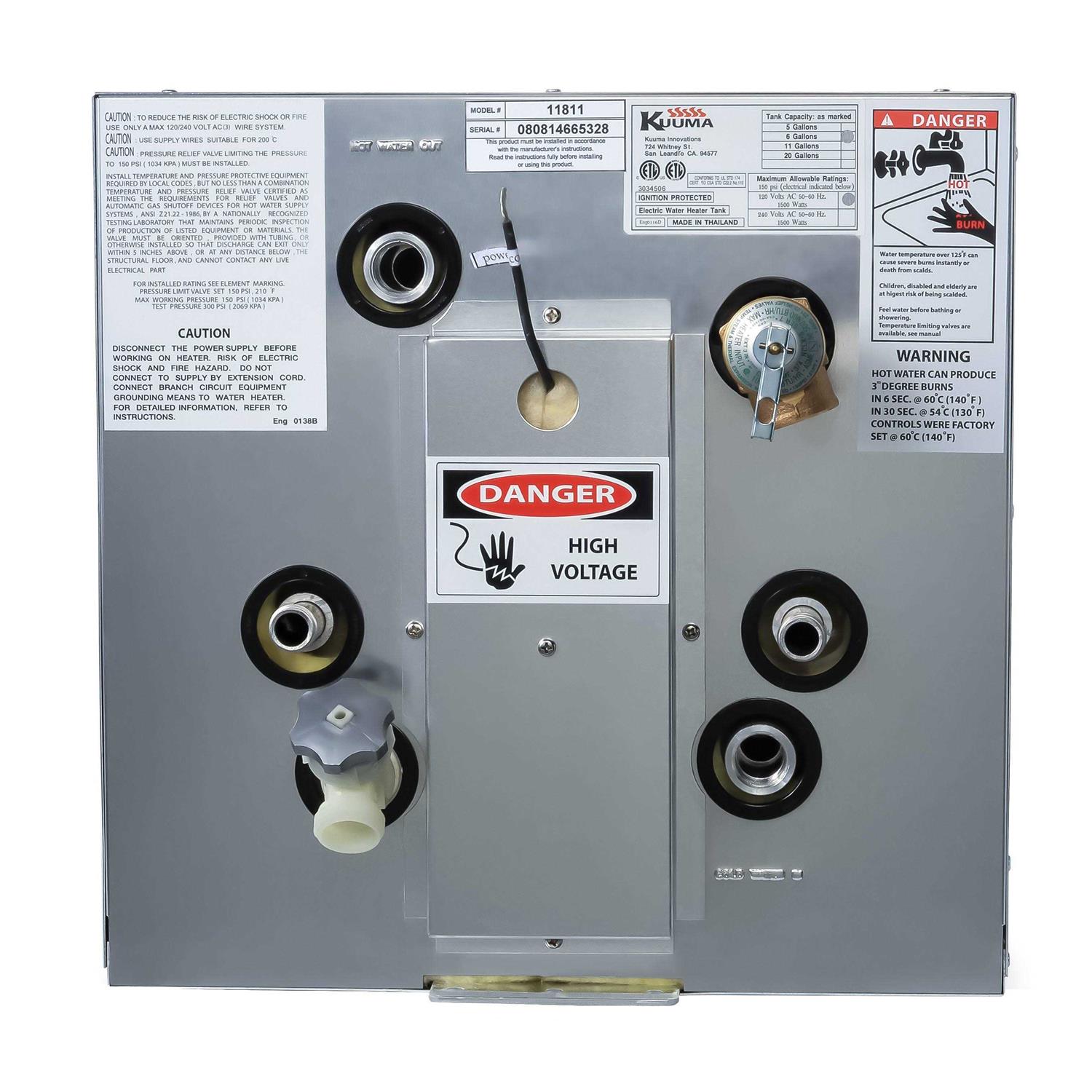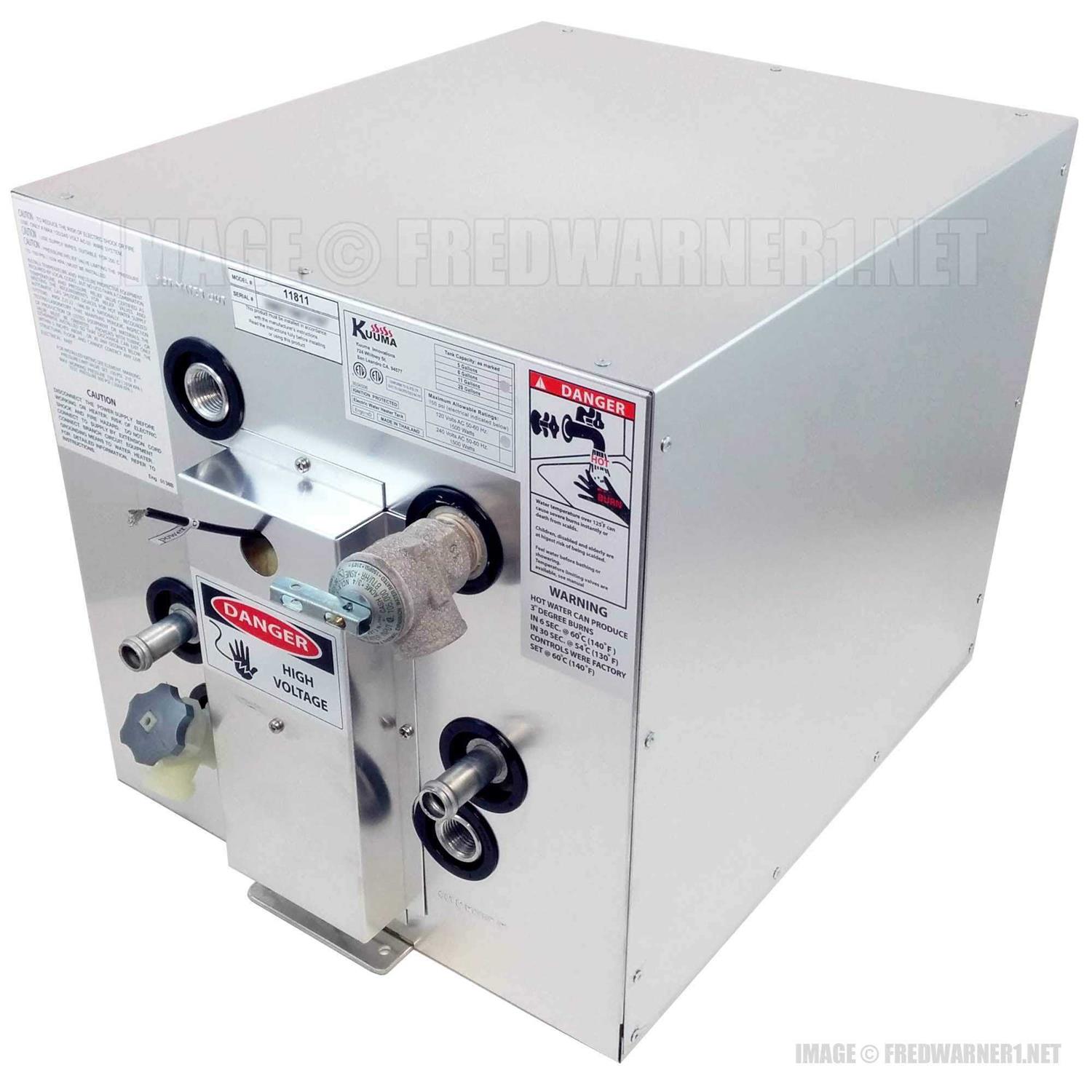 The durable Kuma 120 Volt Water Heater with Heat Exchange keeps the potable water on your boat at a consistent 140 degrees while dramatically reducing the risk of scalding. Aluminum tanks and an aluminum alloy case eliminate dissimilar metals, making this water heater an efficient compact solution. The powerful 1500W element uses 1/2 inch NPT hot/cold connections. The safe and reliable ignition is both UL-certified and CE-certified. This front-mount boat water heater is available in a variety of sizes.