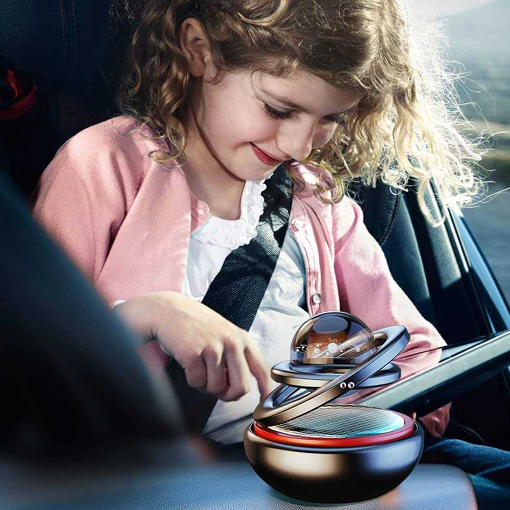Solar Power Air Freshener: directly powered by solar energy, which drives the motor to rotate, full of sense of technology, no need of cell, eco-friendly.Products need direct sunlight. Ocean Perfume: mild and non-irritation fragrance, pure plant extraction essential oil, safe for children and pregnant woman, fill the carriage with good smell, dispel peculiar smell and cover smell of cigarettes Fashion High-Tech Desgin: Two rings to rotate cystal ball, like a interstellar screen to show on, with solar power Compact size for space-saving: Without occupying much space, you can easily place this diffuser on your desk, countertop Easy to install: unscrew the cover, put the perfume pad into and screw the cover, tear the tape to fix the air freshener br Item specification: br Model: QTT213 br Colour: black, red br Material: metal body, perfume pad br Type: seating-type air freshener br br Features: br Full of high tech desgin air freshener br Remove peculiar smell, Cover the smell of cigarettes br A diffsuer to spread mild and non-irritation fragrance br Build a interstellar atmosphere in your car br
