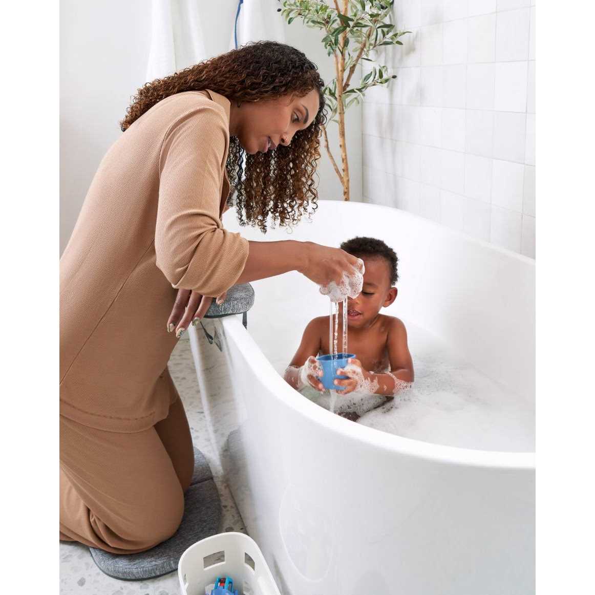 This two-piece set is designed for elbow and knee comfort while washing and playing during bathtime. The elbow cushion suctions to the tub for easy cleaning, while the knee cushion protects your joints. When bathtime is over, they fold away for easy storage.