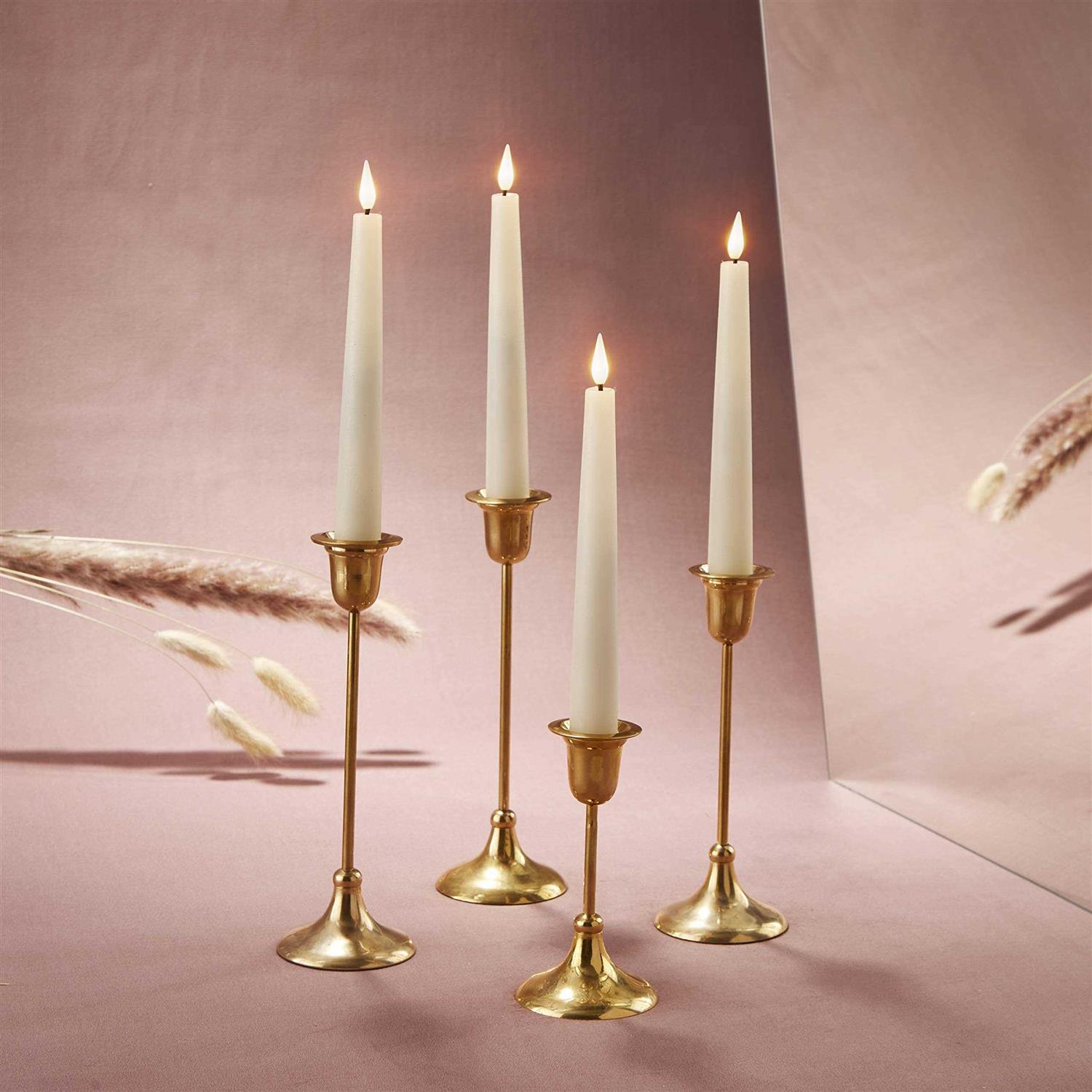 This candle set includes four elegant ivory taper candles featuring our distinctive Infinity Wick flames. They are a beautiful, versatile addition to any style of decor, boasting a real-wax exterior finished with a unique, distressed texture and neutral ivory hue. These tapers will fit most standard taper candle holders, and the included remote with timer make these Infinity Wick Candles an ideal gift for Christmas, housewarming, or for the newlyweds in your family. Place among botanicals to accentuate a floral centrepiece to elevate any dinner table, group together on a side table or mantel, or distribute around a room to bring a touch of cheer to shadowy corners. Perfect for home, weddings, churches, restaurants, and events. The Infinity Wick Collection of flameless candles is a triumph of innovative and creative home decor. Each candle is topped with a black wick and an incredibly realistic flame. This dramatic detail makes the Infinity Wick Candles perfect for everyday or special occasions – they look incredible in real life and photograph beautifully. Four flameless taper candles measuring .75″ in diameter and 7″ in height, featuring our distinctive and ultra-realistic Infinity Wick flame . These candles come in a distressed ivory finish and are perfect for holiday or all year long . Use the included six-button remote to choose between steady or flicker, and set the optional four or eight-hour timer . Powered by one AAA battery per candle, already included in the brightly colored, gift-ready packaging .