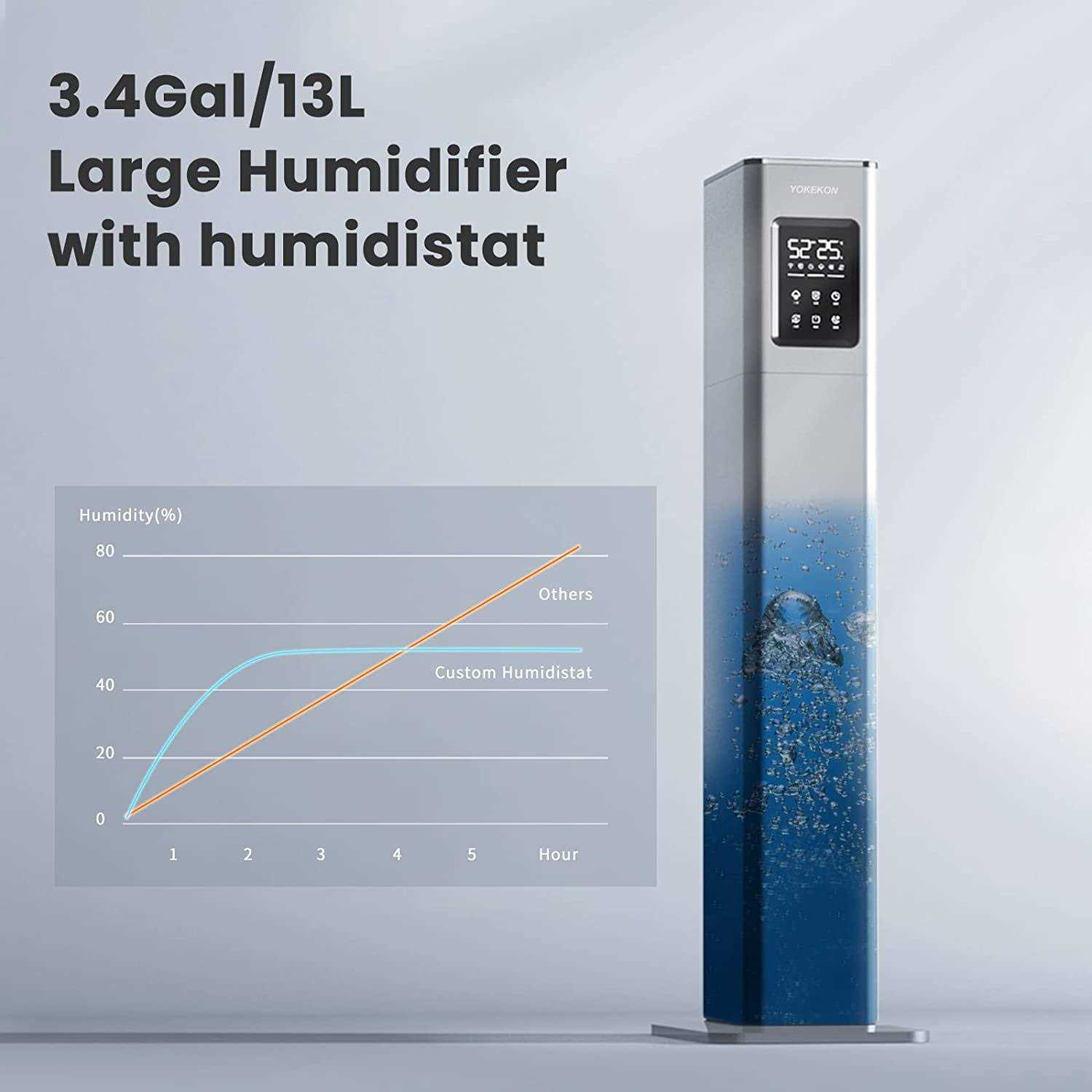 Tower humidifier with top fill design adds water from top. [Large Ultrasonic Humidifiers for Bedroom] Designed for large rooms up to 500 ft² with 13L large capacity water tank long lasts for 40 hours humidification between refills.