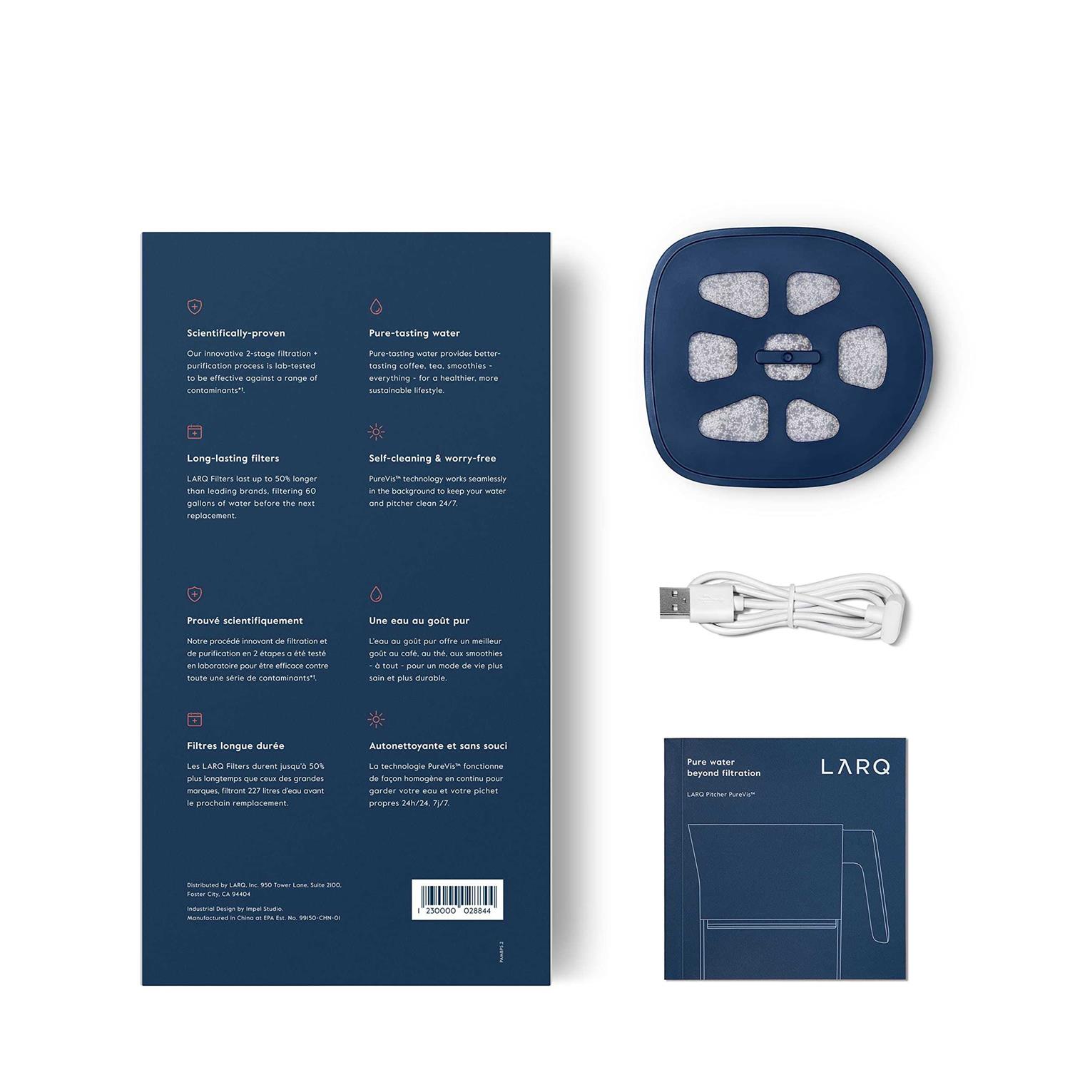 Traditional pitchers filter to improve taste, but only trap and collect unwanted pollutants—making the filter itself a source of contamination from bio-contaminants like bacteria. The LARQ Pitcher goes beyond filtration with a unique 2-step process that not only filters, it purifies! No compromises here. The LARQ Pitcher removes unwanted pollutants and leave you with pure, crisp, fresh-tasting water sip after sip. LARQ’s replaceable, plant-based carbon filter effectively removes chemicals like chlorine and other particulates to improve the taste of your water. Next, PureVis UV-C purification technology eradicates and destroys harmful bio-contaminants at the molecular level. You can activate purification any time with the simple push a button. The self-cleaning mode activates automatically every 6 hours for 15 seconds to ensure your pitcher and filter remain germ-free. Intelligent filter life tracking means you’ll always know exactly when to change your filter—no need to count the days. LARQ Filters last up to 50% longer than leading brands, filtering up to 60 gallons of water before the next replacement. The LARQ Pitcher PureVis wand will flash an orange light to let you know when it’s time for a filter replacement. Integrated smart sensors track the amount of water filtered through and flow rate so you can keep tabs on the filter life, as well as the water quality and household hydration, all from the LARQ app on your phone.