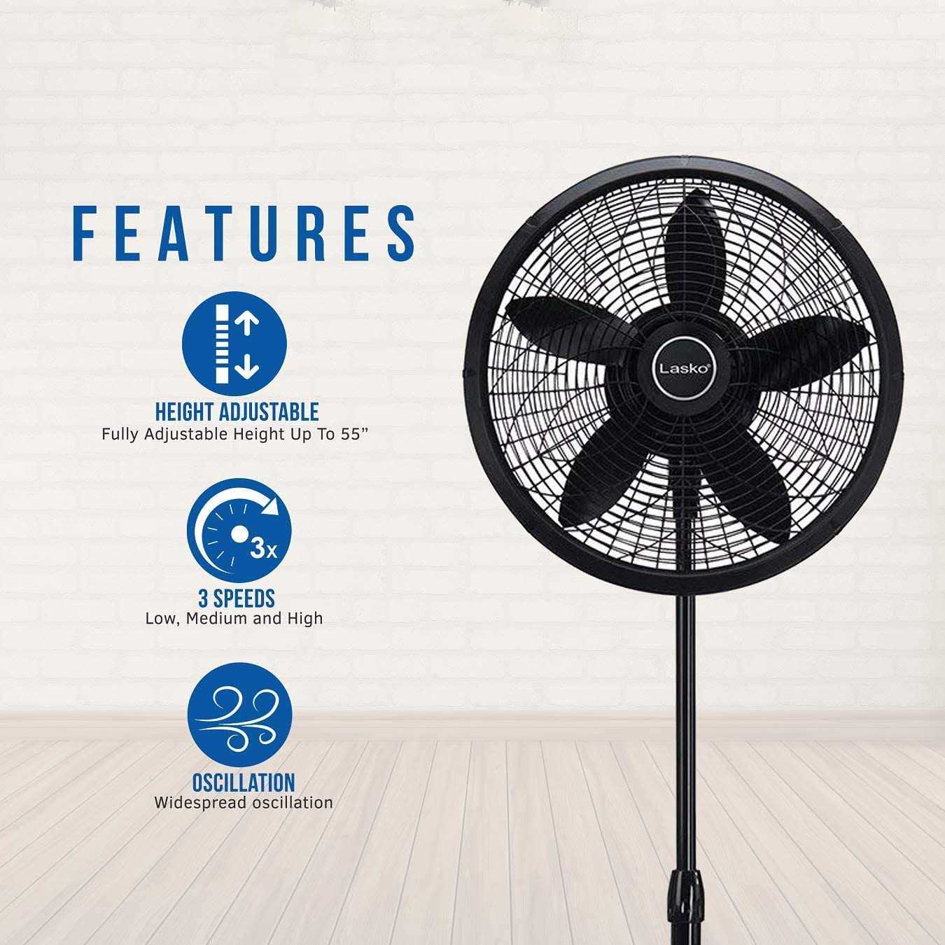 Blend style and functional cooling in your space with this 18-inch Lasko Elegance & Performance pedestal fan. The adjustable height allows use in different setups, while the tilt-back fan head allows easy adjustment. Widespread oscillation ensures even air circulation around the room, and the 3 speed settings enable customization. This Lasko Elegance & Performance pedestal fan has a lightweight design for easy carrying. Pedestal fan ventilates all corners of the room. Lightweight design is easy to carry from room to room. 3-speed fan allows customization as needed. 5 blades offer powerful airflow for effective cooling. Dimensions: Lasko fan measures 54-1/2″H x 20-1/2″W x 20-1/2″D.
