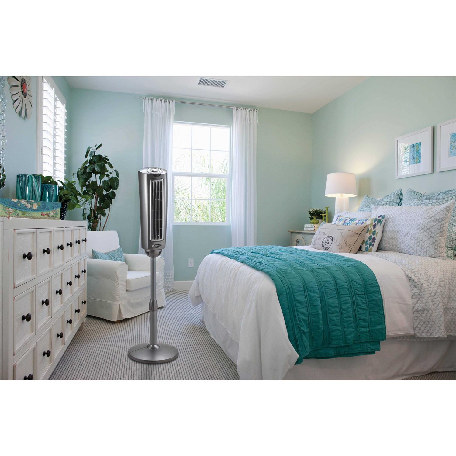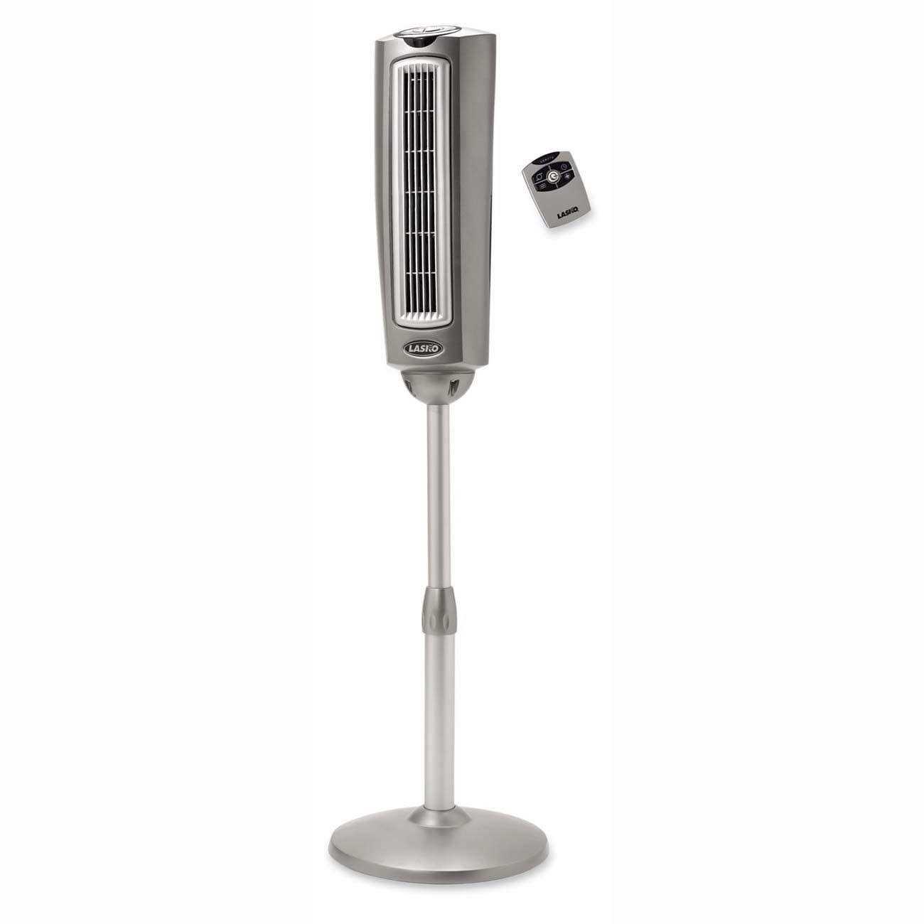 When space is at a premium, the Lasko 2535 52-Inch Space-Saving Pedestal Tower Fan provides the cooling power and portability of a pedestal fan in a slim, adjustable-height design. With 3 quiet speeds, widespread oscillation, and directional louvers, this powerful pedestal fan keeps the air flowing in any room of the house. The 2535 is fully adjustable from 41-52. Convenience is key with this Lasko pedestal tower fan. You can take a hands-off approach to controlling the air flow in your room when you program the automatic timer, which shuts the fan off after the selected time, up to 7.5 hours. Or, use the one-touch Sleep Mode to automatically set the timer to run for 6 hours. Also, the convenient, multi-function remote control allows you adjust the fan speed, timer, oscillation, and sleep mode from a distance. Youll have peace of mind every time you turn on the Lasko 2535 fan. It features a trusted, fused safety plug – the Blue Plug – as an added safety feature. That means its designed to stop the electric current to the fan if the plugs fuse identifies a potentially hazardous electrical fault.