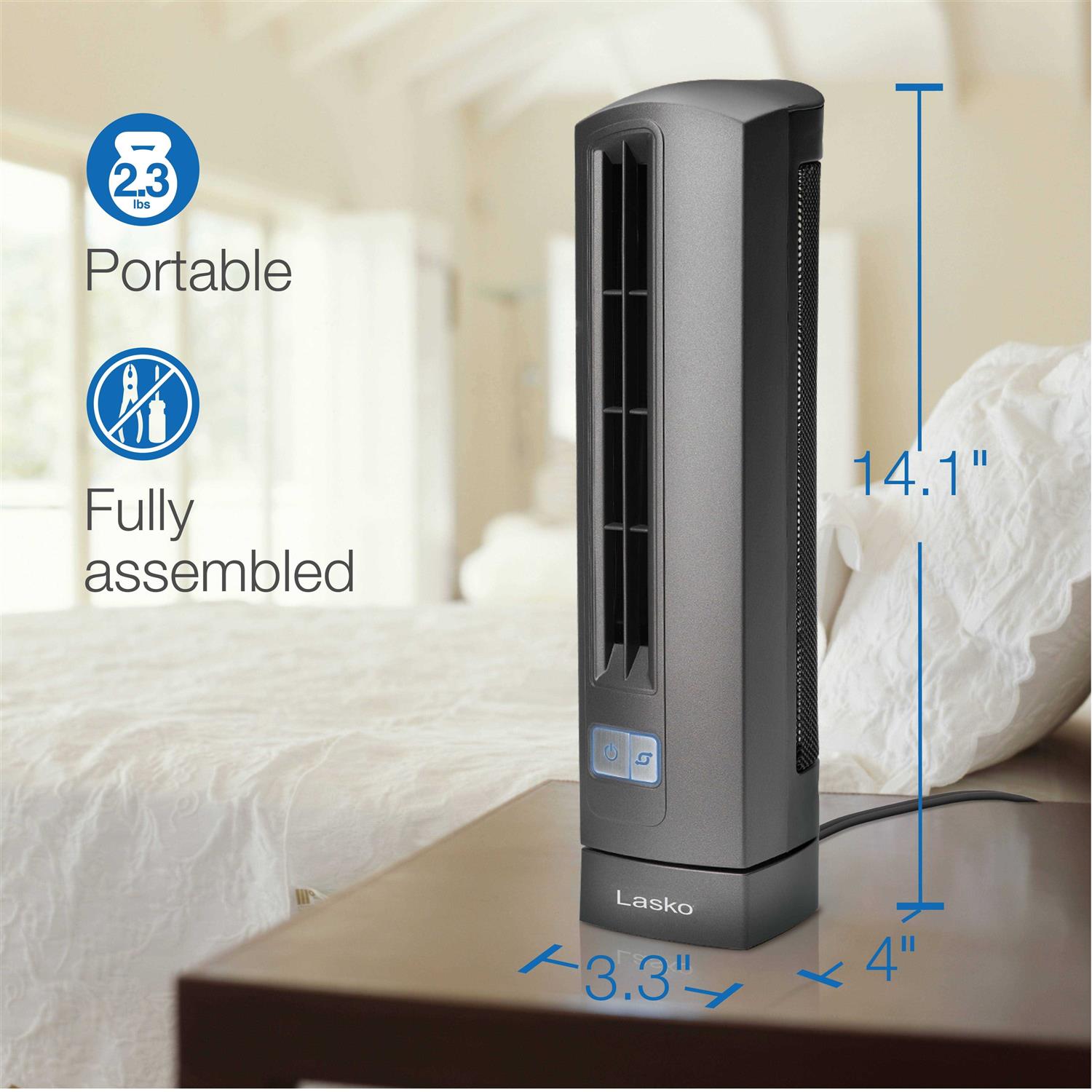 The Lasko Air Stik ultra-slim oscillating fan is a great little office companion. Fitting elegantly in any size space, this tall and slender tower fan has a stylish look. Quite powerful for its size, its two fan speeds deliver a refreshing breeze. Its electronic controls have a beautiful blue LED light illuminating its power and oscillation buttons. Safety features include a patented fused safety plug.