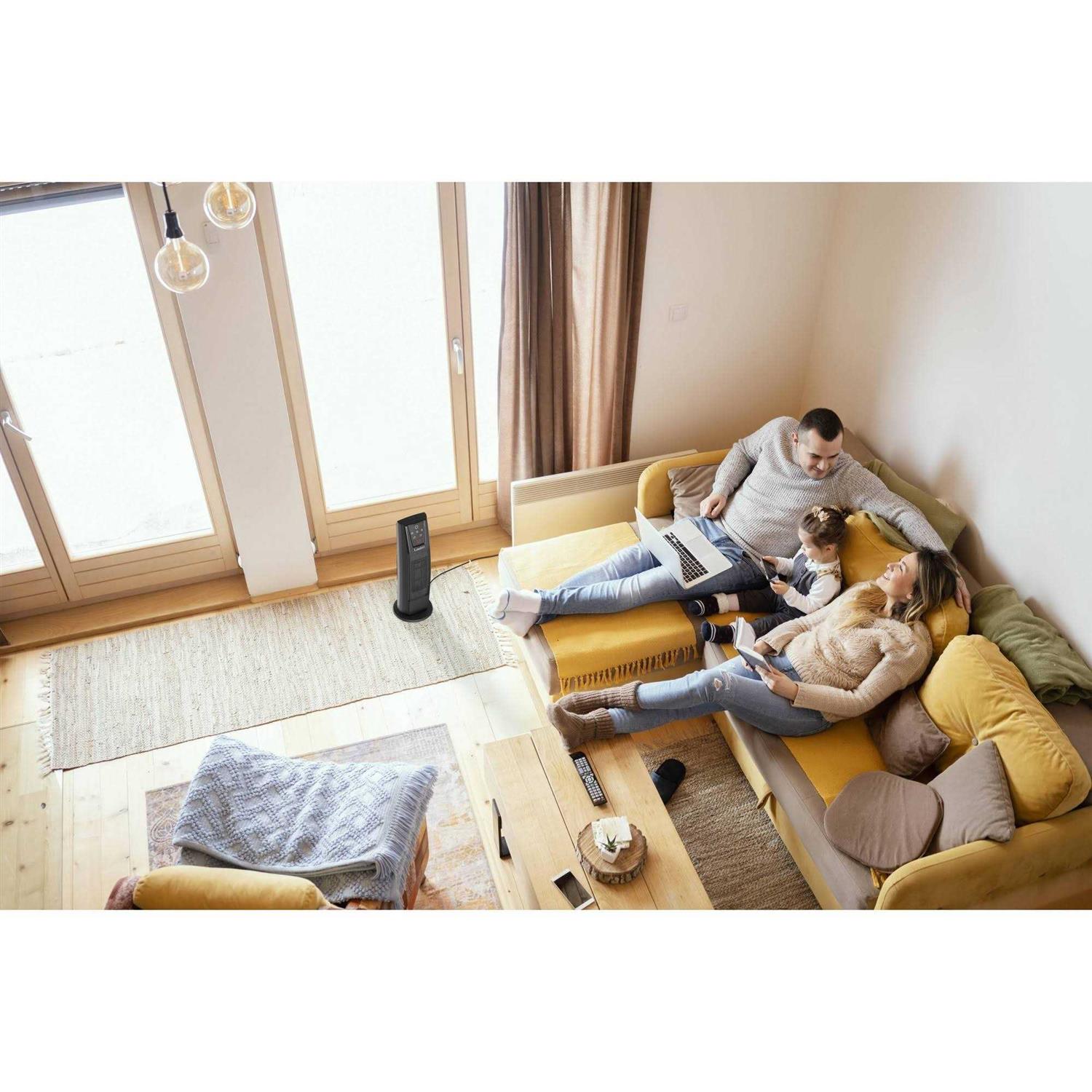The versatile mid-size Digital Ceramic Tower Space Heater from Lasko is perfect for the bedroom, home office or any room in your home. The front-facing electronic controls are always within reach and the large digital display is easy to read. This ceramic space heater features 2 speeds, an 8-hour timer that can be set in 30-minute increments, widespread oscillation, and an adjustable thermostat. The multi-function remote control will operate the heater functions from a distance. Plus, there is storage for the remote control on the back of the heater. This electric heater is easily portable with the built-in carry handle. Safety features include automatic overheat protection and a cool-touch exterior for peace of mind. Requires simple, no-tools assembly.