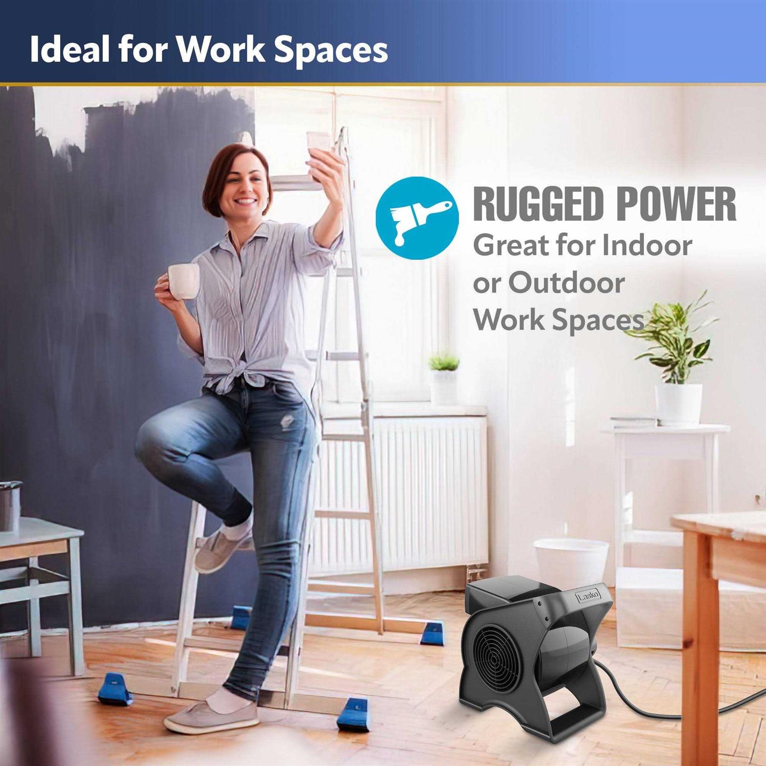 Lasko Pivoting Pro Blower Fan is a unique multi-purpose pivoting utility fan that is ideal for use in tight spaces where fresh air is essential such as work spaces attics basements and garages. Packed with features to help at the worksite it is equipped with a patented pivoting action allows you to direct the airflow right where you need it–from circulating air at floor level to exhausting the air from a newly-painted ceiling and anywhere in-between. Three high velocity speeds and a focused air stream bring powerful performance. Includes 2 additional outlets a circuit breaker with reset and a grounded plug for safety and convenience. Comes fully assembled. ETL listed.