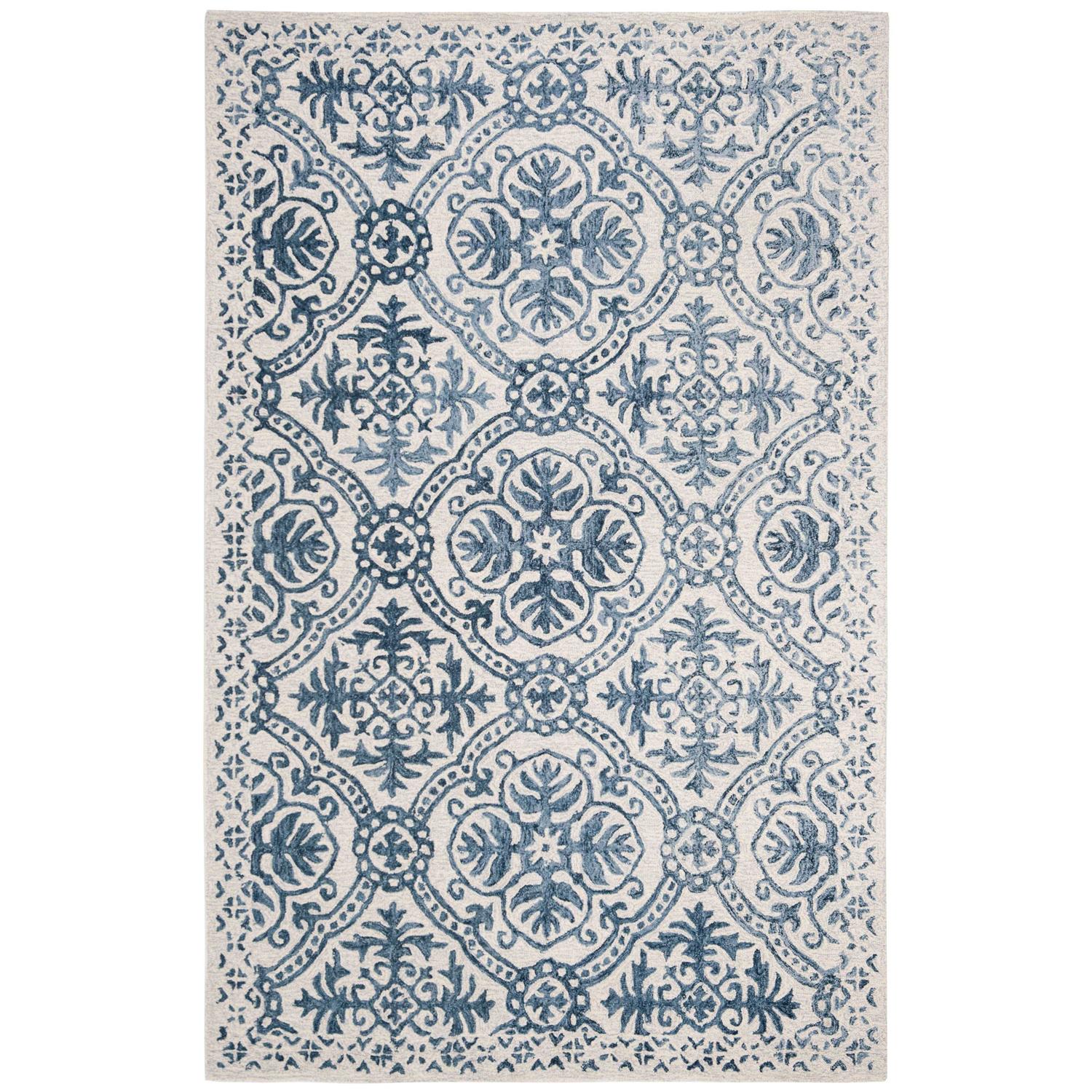 - Classic Art Deco-inspired motifs create a delicate filigree in soft denim over gentle ivory hues.