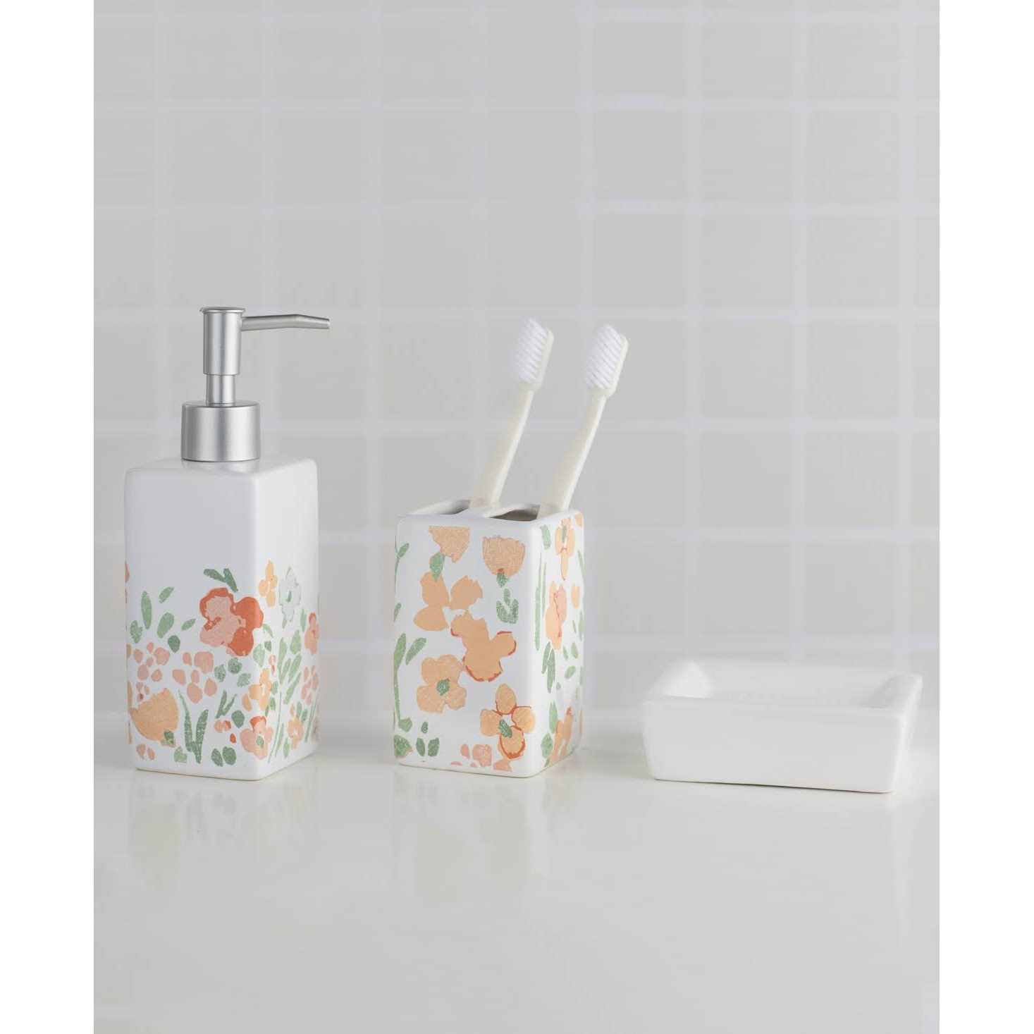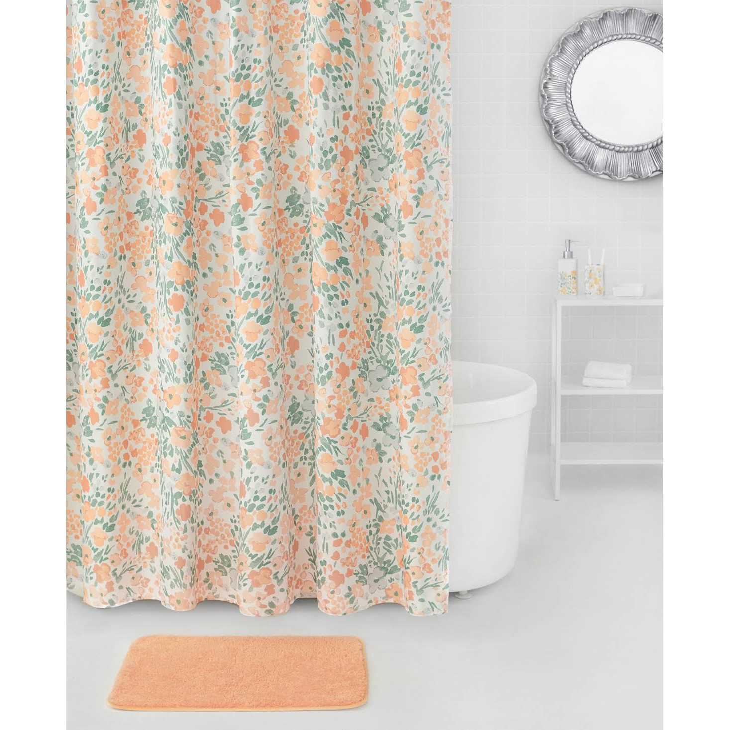 Organize and decorate your bathroom for a stylish new look. This durable and high-quality set is made to last. This unique, stylish bathroom decor set also includes a matching ceramic set for the countertop; this includes a ceramic soap or lotion dispenser, a ceramic toothbrush holder, and a ceramic soap dish. Aside from its stylish look, this functional bathroom accessories set also has all the bathroom essentials you need. The shower curtain is machine washable and fits most standard sized bathtubs and showers. It’s great for yourself or as a gift for someone who is just starting out in their own home décor adventure.Material & DimensionsShower curtain is made from 100% polyester and measures 70” x 72”. Bath rug is also 100% polyester and measures 17” x 24”. All three ceramic countertop accessories, including the soap dish, lotion pump, and toothbrush holder are crafted from dolomite. The metal shower curtain hooks are crafted with rust-resistant polyresin.