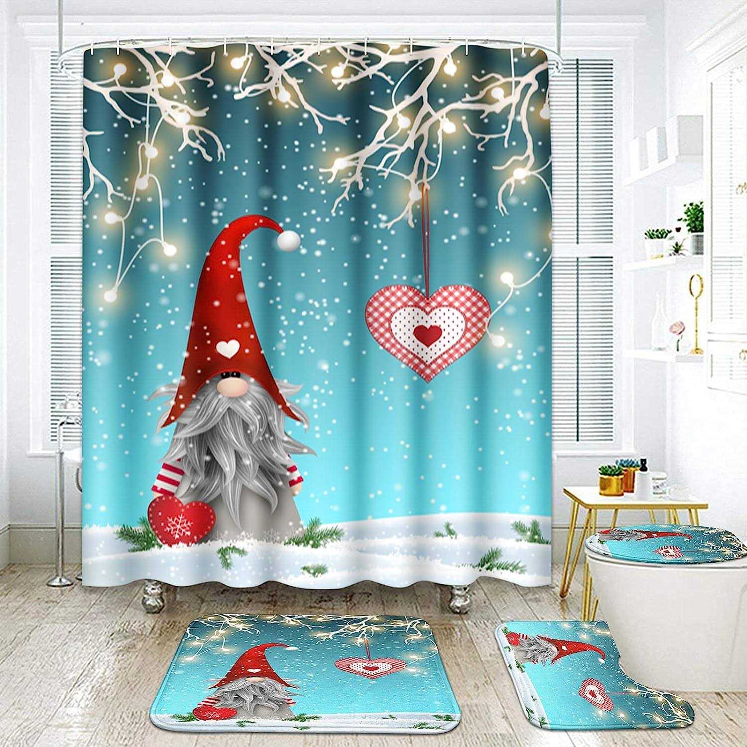 LAYINUSG 4pcs Merry Christmas Shower Curtain Set with Non-Slip Rugs, Toilet Lid Cover and Bath Mat, Xmas Winter Holiday Bathroom Decor with Hooks 72
