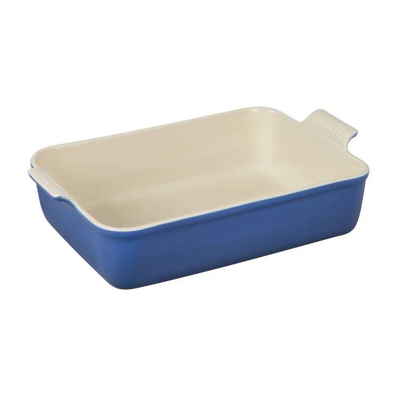 Our largest baking dish yet, the Le Creuset Heritage Lasagna Deep Baker is generously sized with over 6 quarts of capacity for towering layers of lasagna, whole roasted turkeys or prime rib, casseroles for a crowd, and more. Designed to perfectly fit most brands of lasagna noodles, the more than 4 inches of depth provides ample room for several layers of noodles, melting cheese and bubbling sauce without spilling over. From oven to table, the beautiful classic French design with scalloped handles is crafted from premium stoneware for exceptional heat distribution to ensure food is uniformly brown and cooked to perfection. The durable colorful glaze is nonporous, non-reactive and virtually nonstick for easy cleanup.Features Beautiful classic French Heritage design with scalloped handles; Designed to fit most brands of lasagna noodles with room for several layers; Nests perfectly with our 9×12 inch Heritage baking dish; Premium stoneware ensures excellent heat distribution for uniform browning and even cooking with no hot spots; Superior heat retention keeps food warm or cold for serving; Colorful glaze is non-porous, non-reactive, scratch-resistant, and resists stains and flavor absorption; Virtually nonstick interiors easily release food for quick clean-up, and resist cracking and crazing; Unmatched thermal resistance for temperatures ranging from -9F to 500F; Safe for freezer, oven, microwave, broiler, dishwasher and metal utensils ;