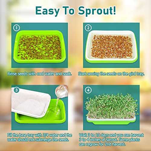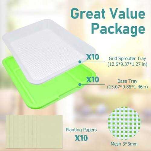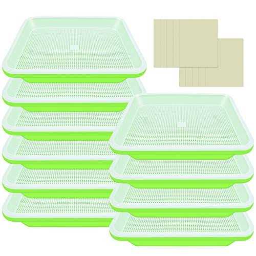 【Microgreens Planting Tray】You will receive 10 sprout planting kits and 10 planting paper. Each set includes an inner tray, and a bottom tray, the overall size is 13.07*9.85*1.46 inches, the large capacity can make the seeds grow better and faster, without soil, just water, even a garden beginner can sprout beans easily. 【Longlasting & Healthy】Seed sprouting tray for sprouts are made of high quality food grade PP material, tasteless and durable. You can use these seed sprout tray with cover with confidence and enjoy healthy and green food at home, adding healthy veggies to your table. 【Easy To Use】Concave-convex design makes it easy to take out the inner mesh tray, the inner mesh tray provides excellent breathability and promotes seed germination, the mesh size is small enough to keep the seeds from falling through.Transparent lid can keep your eye on plant grow of microgreens! 【Wide Application】The sprouting container is perfect for sprout Micro-Greens of seeds, such as such as mung, wheatgrass, cat grass, peas, vanilla, radish, perilla, peanut, radish, alfalfa, and other microgreens seeds indoor and outdoor. 【Warm Tips】Our nursery tray can sprout multiple types of seeds,and if the seeds are too small, you can place planter paper on the mesh tray to prevent seeds from leaking. Don’t put too many seeds so they don’t overlap and mold. Please keep the air ventilated and wait patiently for 3-10 days.