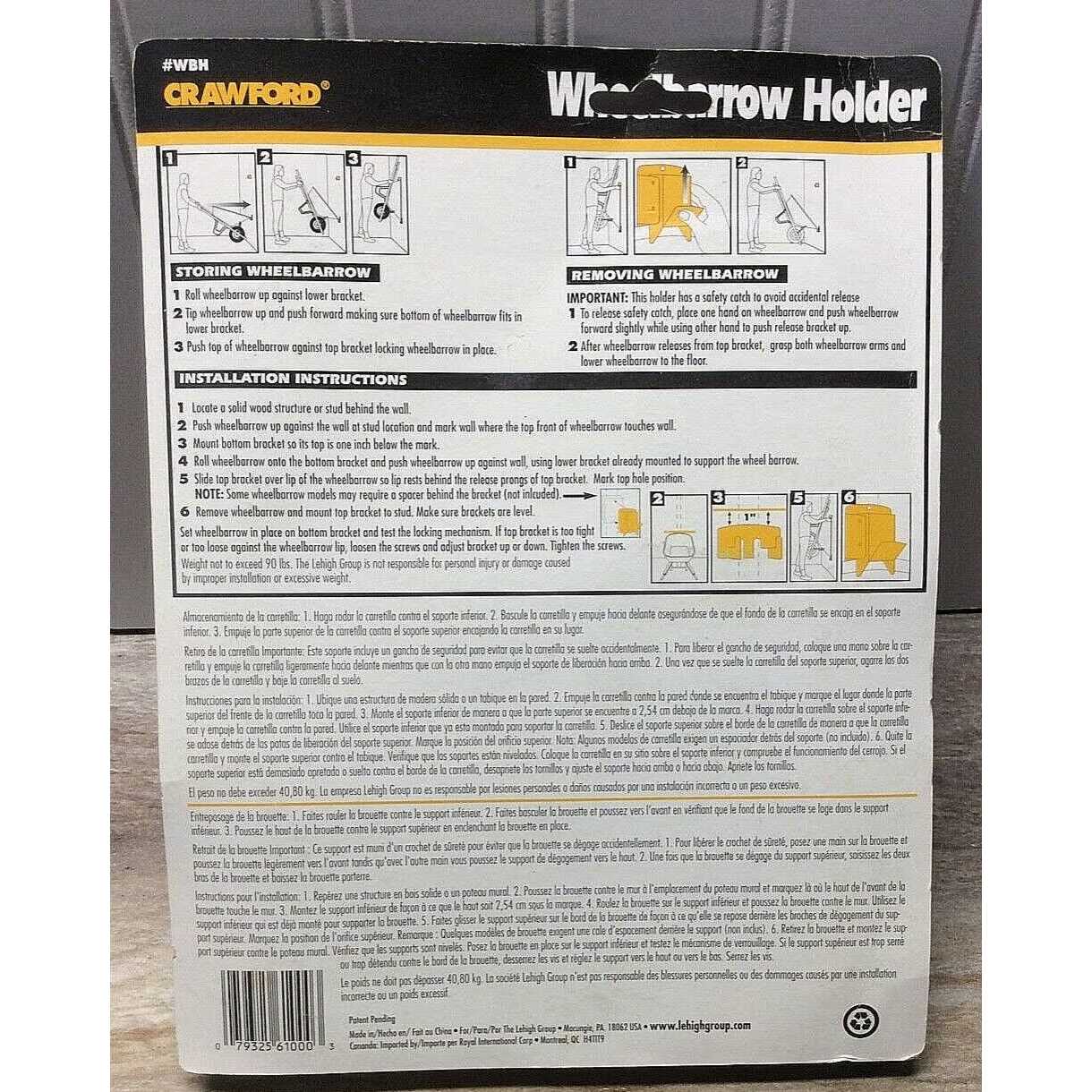 Crawford by Lehigh wheelbarrow holder saves space and stores wheelbarrow against wall in garage or shed. Easy to use no heavy lifting or bending is required. Fits most wheelbarrows including heavy duty contractor types. Made of heavy gauge solid steel. Comes with a spring loaded lift latch for safety which prevents accidental release. Easy to install hardware included. Available in black color. Comes in blister card.