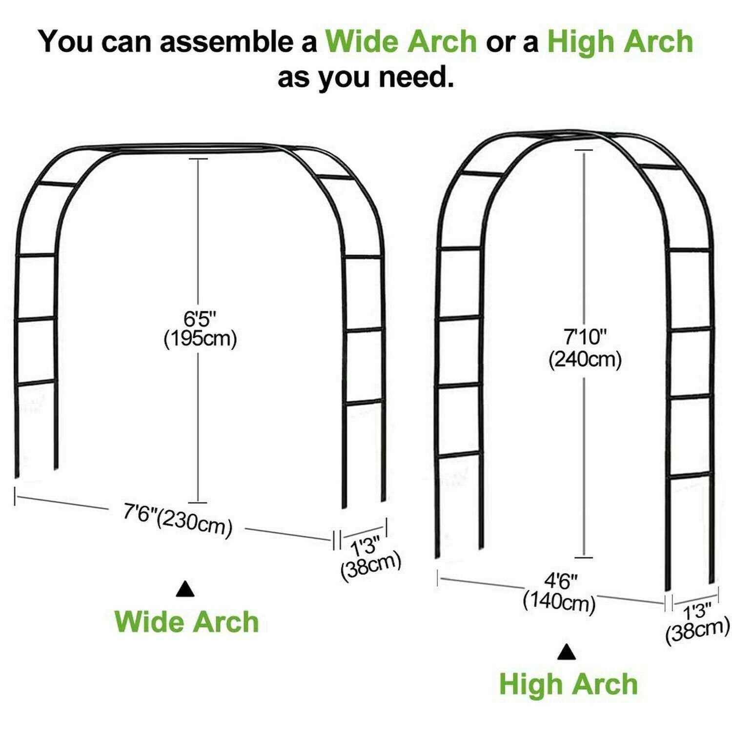 Brand: LeJoy Garden Color: Black Wide Arbor Features: [Assemble Freely]:You can easily assemble a wide arch(7.5 Feet Wide x 6.4 Feet High) or a high arch(4.6 Feet Wide x 7.9 Feet High) as you need. [Lightweight & Easy to Assemble]:Pre-cut and pre-drilled holes;Instructions including illustration is provided. [Good material]:Constructed of metal tubing and coated in weather-resistant epoxy [Add beaty and elegance]:Accentuate the beauty of your backyard with your very own elegant garden feature and create a truly stunning look. [Great For Events]:Such As Weddings, Quinceaneras, or Sweet 16 Birthday Parties Binding: Kitchen Details: Features: As the metal garden arch can be assembled freely,you can assemble a wide arch or a high arch as you need.Don’t worry about how to assemble.The instrucions including illustrations will tell you how to assemble a high arch and a wide arch.Besides,there’re pre-cut and pre-drilled holes,you’ll find it’s very easy to assemble ad disassemble. Specification: Material:metal tubing coated in weather-resistant epoxy Color:Black Arch’s size 7’6 W x 6’5 H or 4’6 W x 7’10 H Decorated with:various Climbing Plant,tulle, balloons, foliage, lights or anything else. Suitable for:Wedding,Quinceaneras,or Sweet 16 Birthday Parties. Package Include: 1x Gardon Arch(without Plant Boxes,green plants and flowers) 1x Instructions Package Dimensions: 21.6 x 8.0 x 1.5 inches