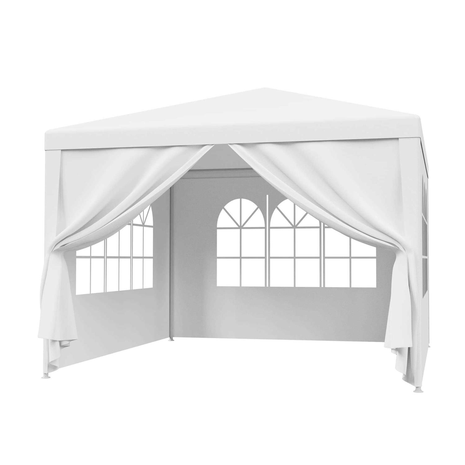 Elegant white design style and straight leg design; Rust&corrosion resistant 32mm/0.6mm thick powder coated steel, Waterproof&Anti-UV 120g Polyethylene cover/sidewalls Heavy-duty bungee cord straps, eyelets and nylon fastener/ High strength PE joint fitting 6 Transparent PVC church windows offer a good flow of light/Removable sidewalls for greater versatility and ventilation Easy to set up, all hardware for assembly;Comes with ropes and stakes for added stability Note:This product is designed for Garden and Leisure events in good weather. Please note as with all products of this type it is not recommended to be left up in the wind.