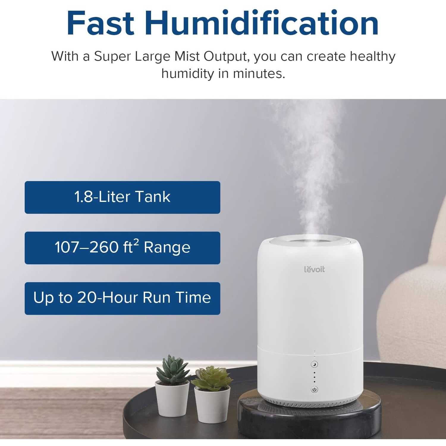- The 0.48 gal/1.8 L tank provides coverage for medium-sized rooms such as bedrooms, offices, and nurseries