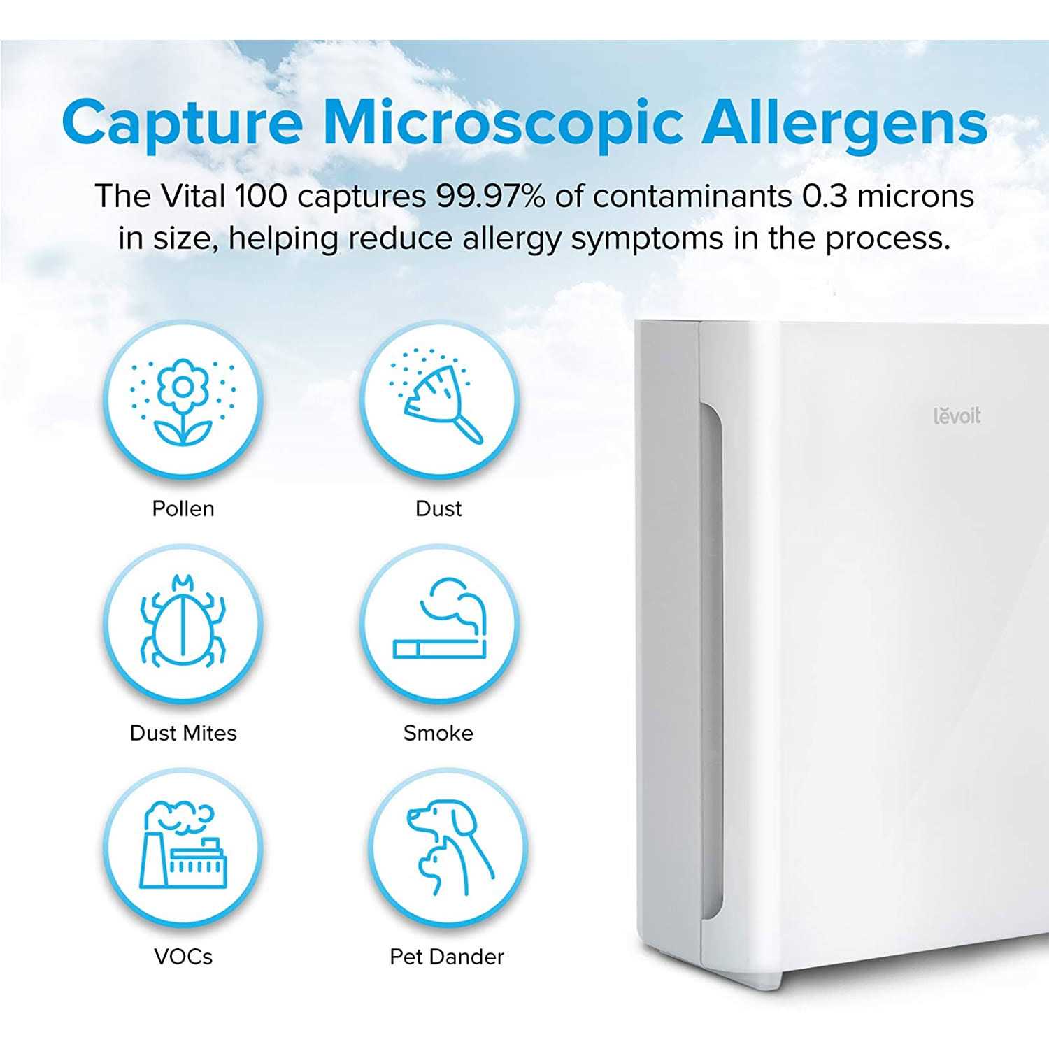 Refresh yourself with clean air by using the Vital 100 True HEPA Air Purifier. The H13 True HEPA filtration traps 99.97% of airborne particles 0.3 microns in size, including pollutants such as pollen, dust, and smoke. It is also effective in rooms up to 300 ft² / 28 m² in size.