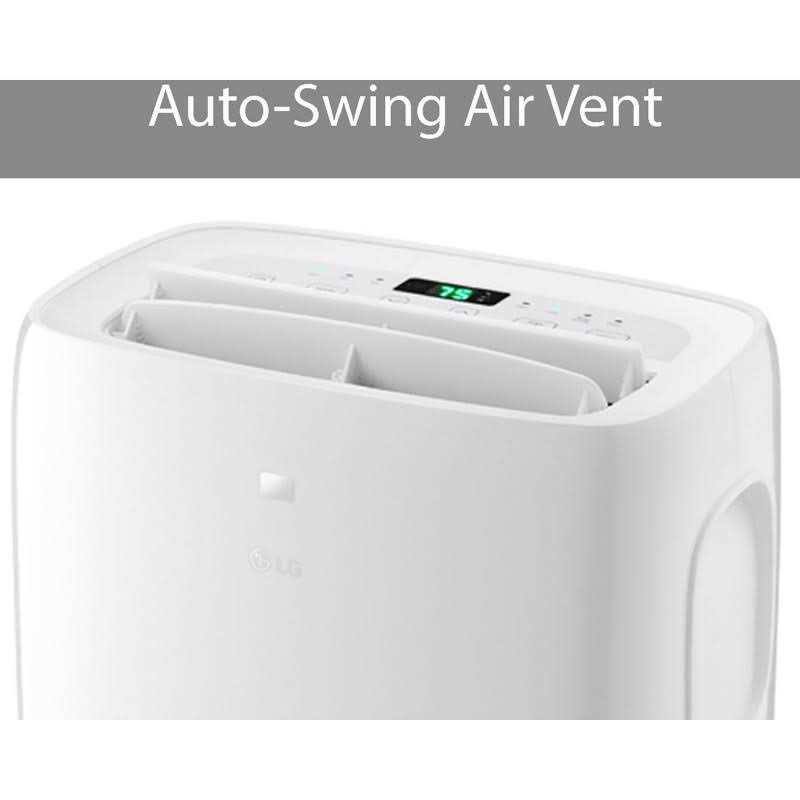 LG 7,000 BTU Portable Air Conditioner This portable air conditioner is a great choice for versatile cooling! This quiet unit is ideal for cooling medium rooms up to 300 sq. ft. The unit has 2 cooling and fan speeds and a 24 hour timer to create a cooling schedule. The auto-swing air vent helps direct the flow of air where it’s needed most whether cooling, dehumidifying or just circulating air. If there is a power outage, the auto restart feature will automatically turn your unit back on when power is restored. Easy rolling casters allow you to efficiently move the unit to another location. Other features include an LCD remote control, easy window venting installation kit, removable/washable filter and a check filter alert.