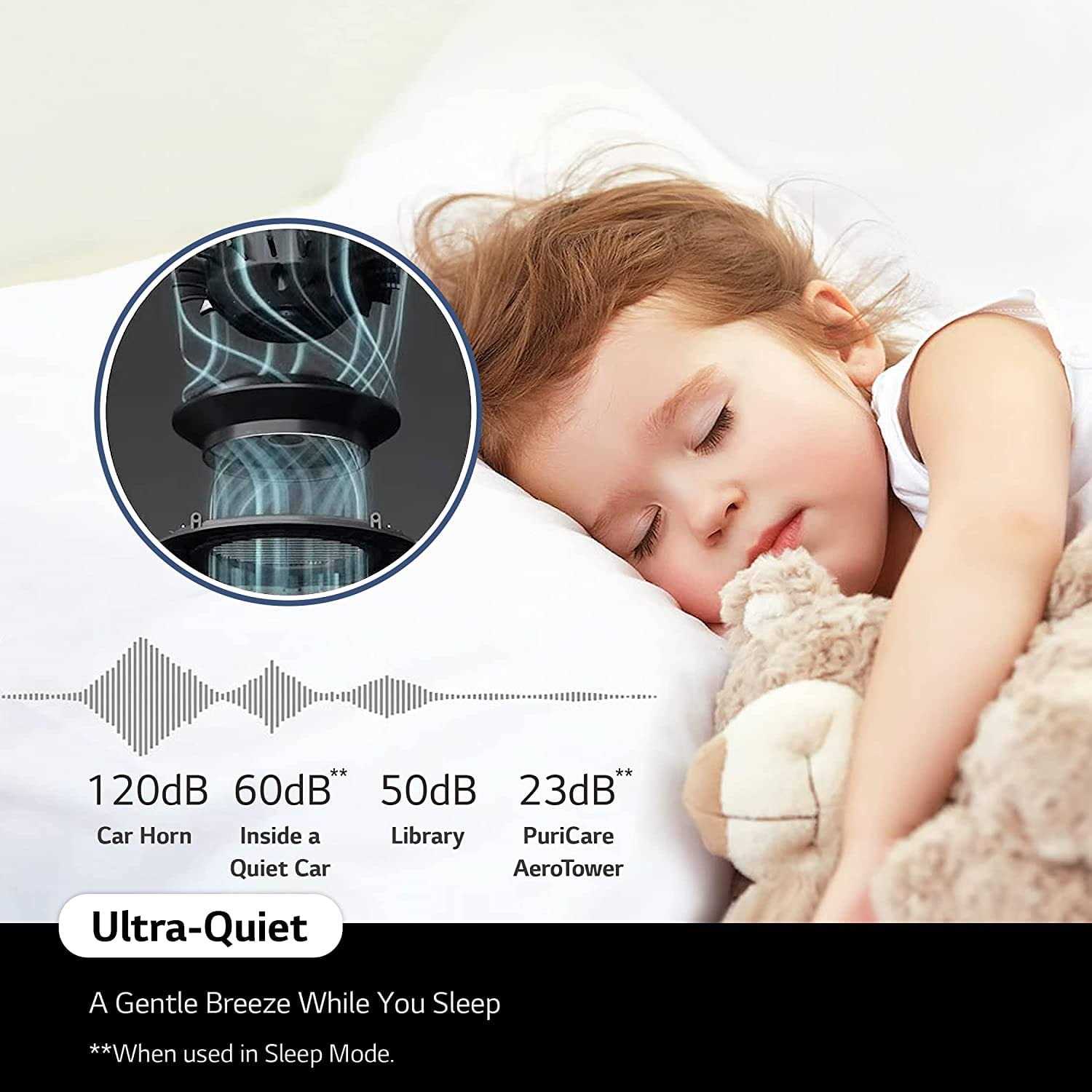 • QUIET AS A WHISPER – The LG PuriCare AeroTower operates at whisper-quiet sound levels as low as 23db.