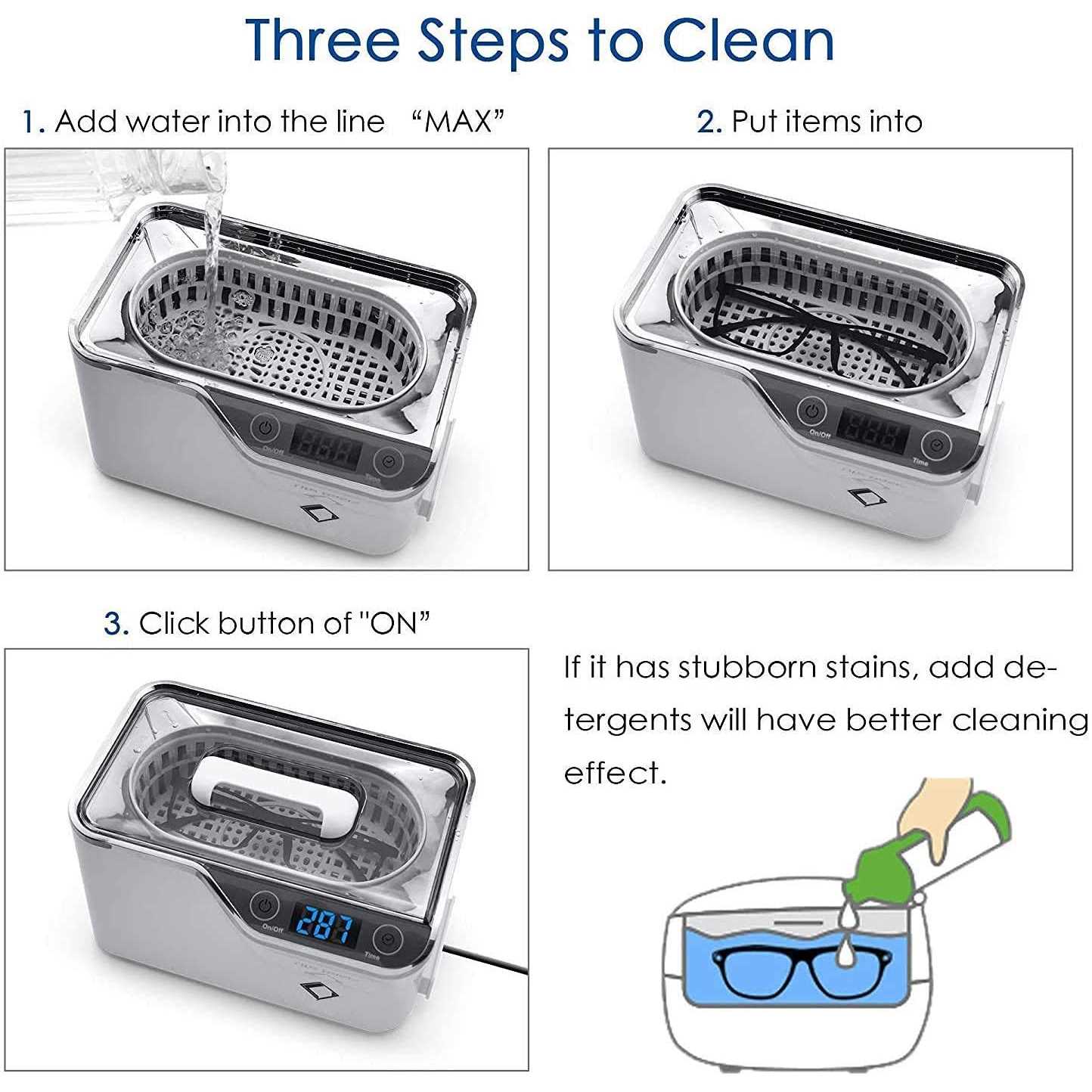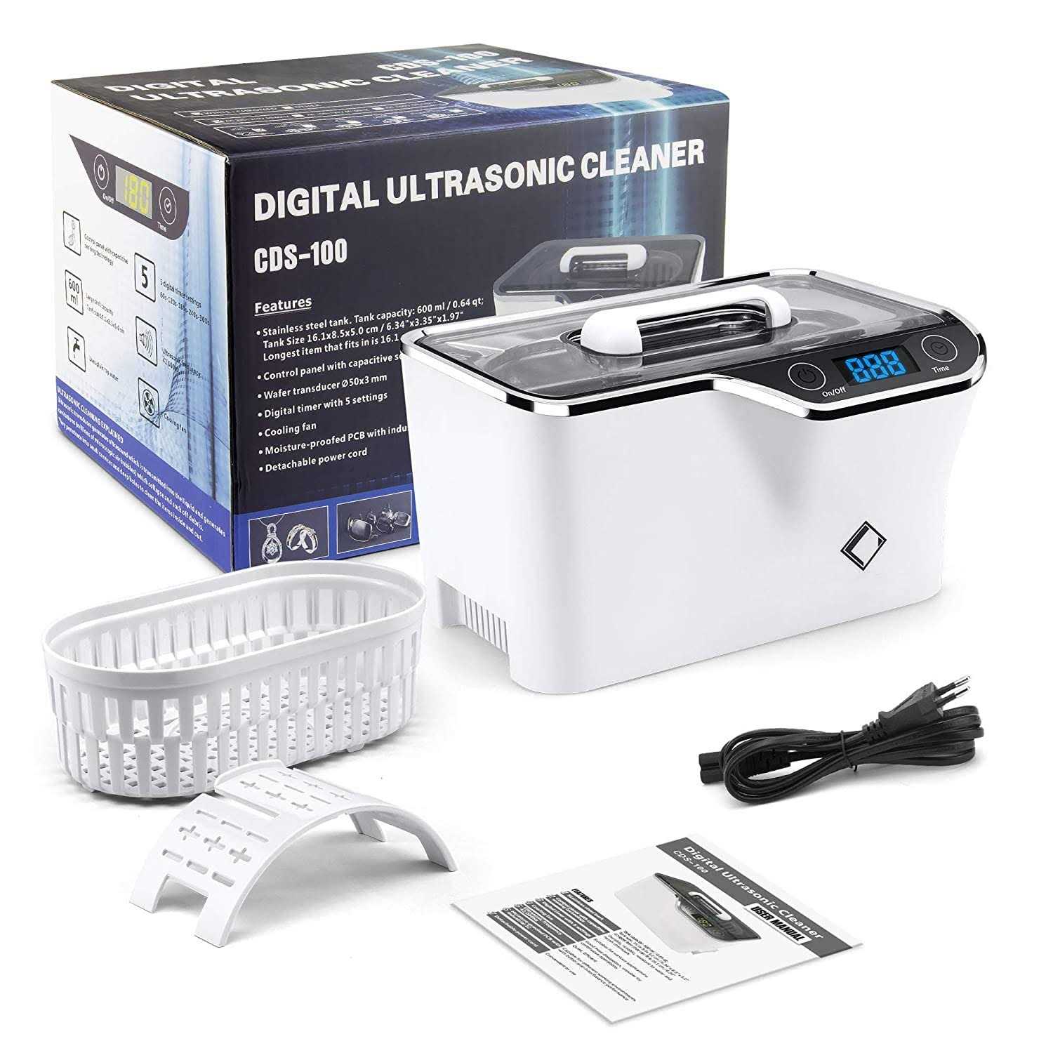 New design: CDS-100 ultrasonic cleaner has more powerful and effective ultrasonic wave (42000Hz) than others (40000Hz), ensures more powerful cleaning results. Touch button: service life is twice longer than mechanical ones. Long lasting working time: mute fans extend working time without affecting the cleaning effect. Practical: removable power cord, it is easy to replace water. 600 ml stainless steel tank, basket and watch stand included. (Note: 1. Please put water into the sink before turning on the machine, otherwise the machine may be damaged. 2. If the lenses have very small scratches, you should not use them for cleaning.) Newly developed ultrasonic cleaning device – The only touchscreen ultrasonic device on the market. PRINCIPLES Works by generating sound waves emitted into the tank and cleaning solution. These waves produce millions of microscopic bubbles that break or implode, releasing large amounts of energy and cleaning the surface. Areas of use: Jewelry stores: restore the shine and then the device removes dirt or harsh powder from unfinished items Opticians and laboratories: removes dirt between the rim and the lenses Home: children’s items; glasses, watch bands, razors, e-cigarettes and others Shooting clubs: use brass cartridges again Watch stores: precise parts cleaning Print businesses: free blocked printheads or ink cartridges Automotive stores: cleaning precision parts such as valves, injectors, equipment, and ball bearings Technical data: Tank material: SUS304 stainless steel. Case material: ABS Digital time settings: 180s-300s-480s-600s-90s Tank capacity: 600 ml / max. 500 ml. Ultrasonic frequency: 42 KHz. Power supply: 50 W (AC 220 – 240 V, 50/60 Hz). Product size: 20.4 x 14 x 13 cm. Tank size: 16.1 x 8.5 x 5.0 cm. Net weight: 0.98 kg. Gross weight: 1.23 kg. Box contents: 1 x ultrasonic cleaner. 1 x watch stand. 1 x operating instructions (digital German instruction manual sent by email). 1 x VDE power cable. 1 x BS power cable.