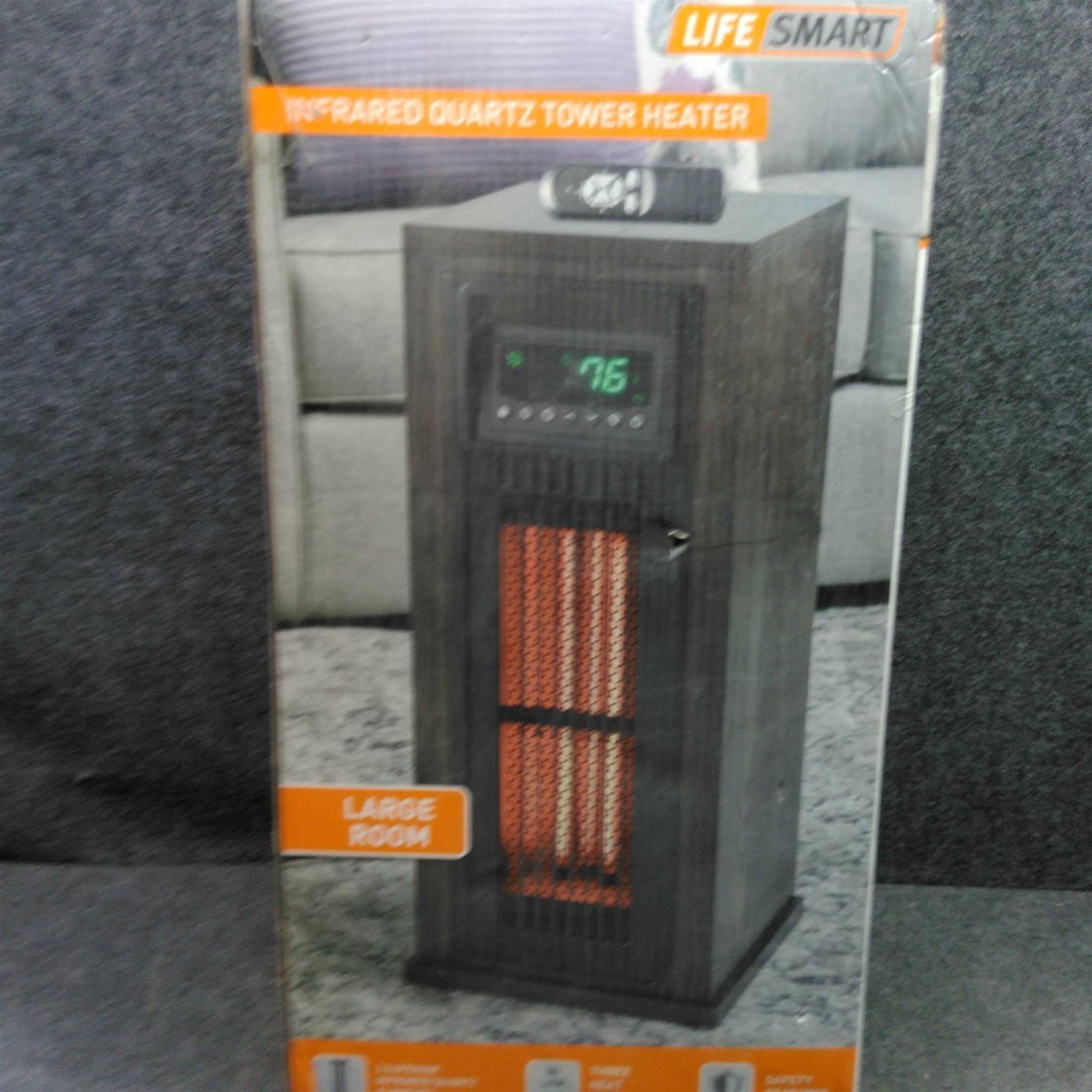 Lifesmart The Lifesmart tower infrared heater is designed for added room warmth when the weather turns chilly. This heater tower features 3- extra-long infrared elements, spreading soft even heat out into the room, targeting people and objects, without drying out the room air. There are 2- heat settings for up to 1500-watt of power, plus an energy-saving ECO mode which takes the heater wattage and self-regulates to maintain a constant 68° using only the most efficient power consumption. The unit features several convenient operating features including a large easy to read digital thermostat, soft-touch button controls, 12-hour count up and count down timer, and a full-function remote control. Safety features include child lock, overheat, and tip-over safety. The large tower design features a stylish all-wood cabinet that will enhance the look of any room, the cabinet is cool to the touch making it safe to be near small children and pets. Enjoy safe healthy heat today with the Lifesmart infrared tower heater.