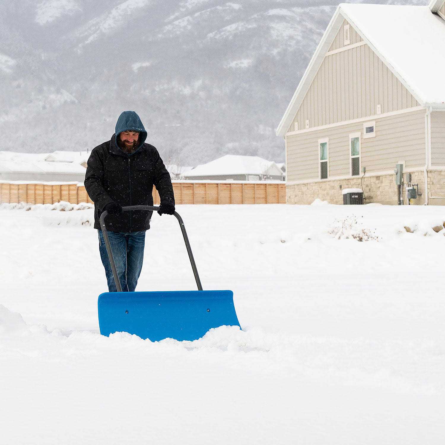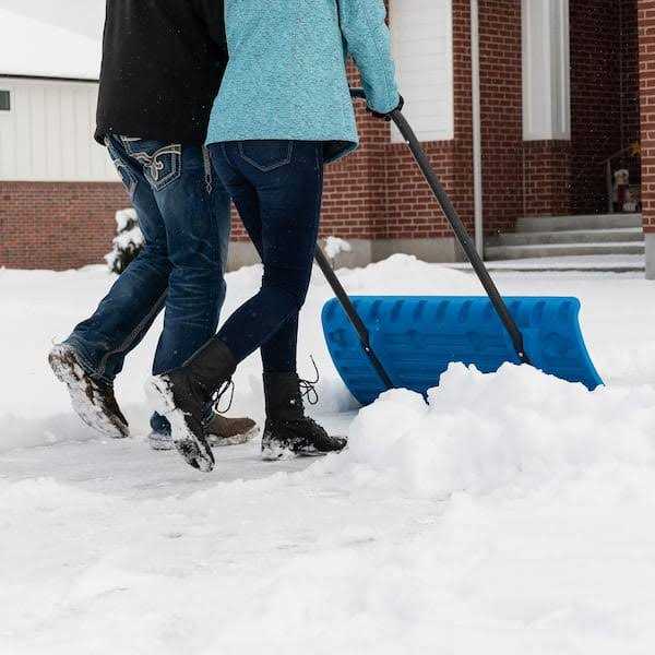 Snow removal is faster and easier than ever with the Lifetime Snow Pusher. At 42 wide, its the perfect size to clear sidewalks and driveways. Youll be able to push it easily using the ergonomic grips and lightweight steel U-frame handle. Enjoy the impressive durability and strength of a high-density polyethylene construction that wont crack or split and wont scratch or scuff your deck and driveway. The flat blade design handles comfortable over cracks in pavement. You can put more weight behind the tool with the dual-support handle, and the upper blade curve keeps snow from falling over the top of it, so you can skiff off snow and keep your walks and driveway clear.