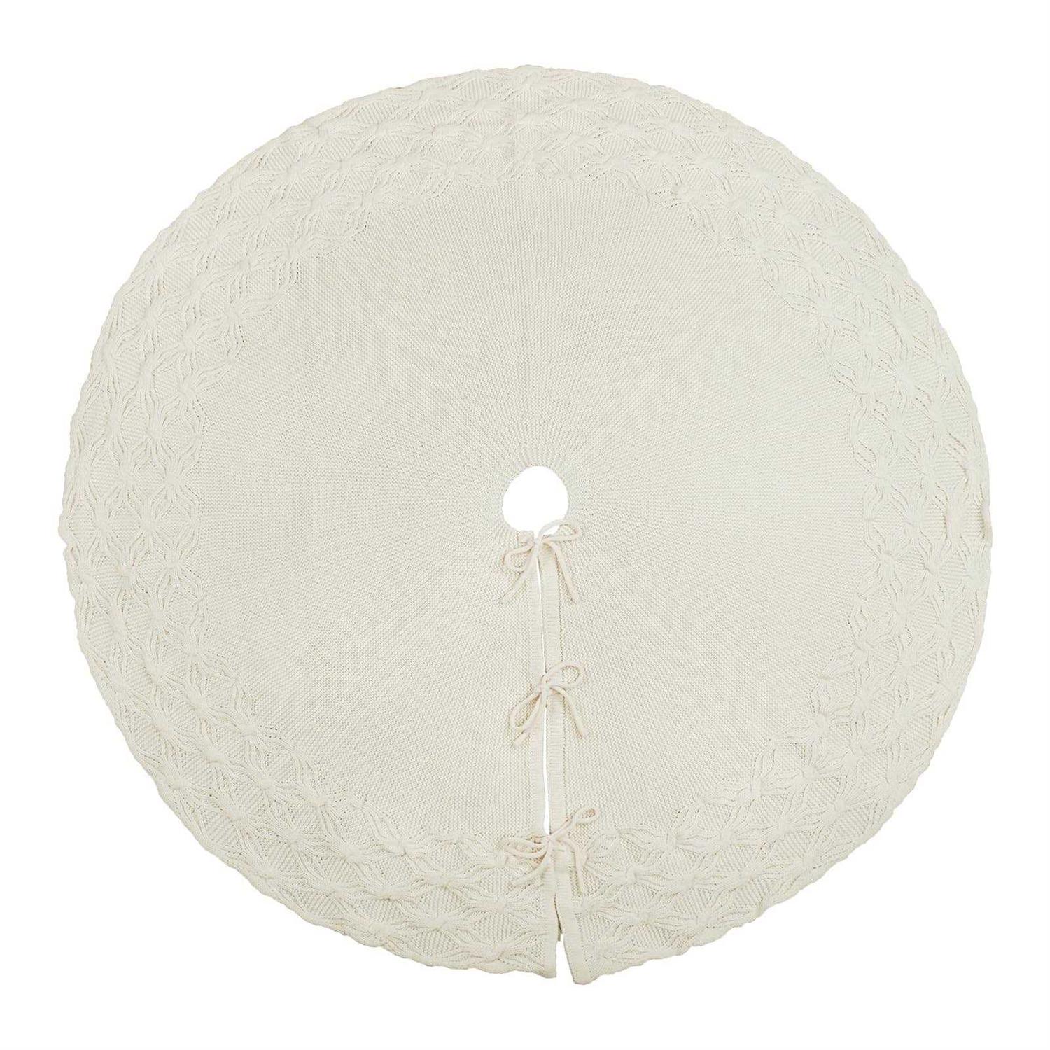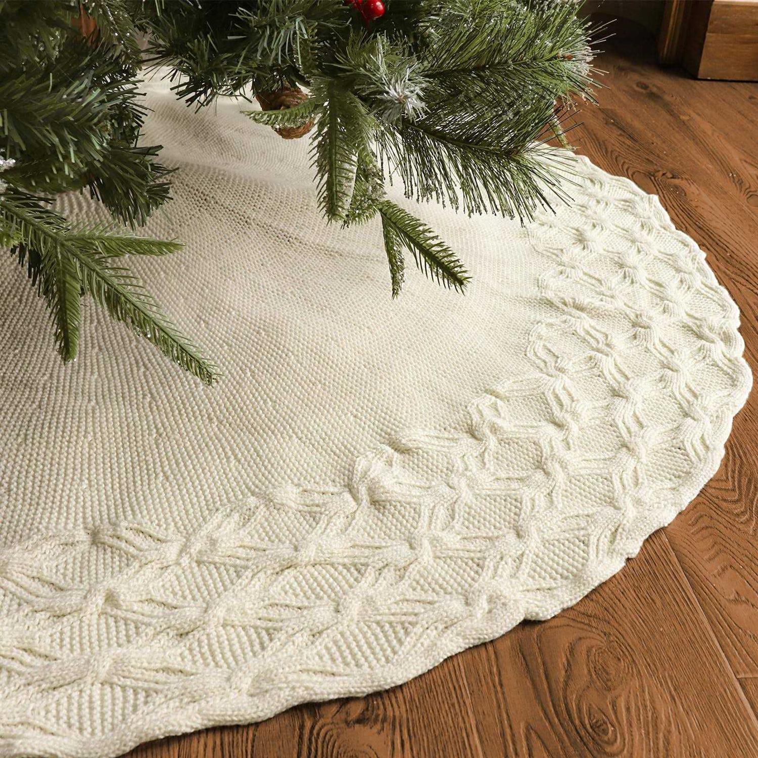 LimBridge Knitted Christmas Tree Skirt: 48 Inches Cream White Tree Skirt, Crossed Willow Leaf Edge Cable Knit Rustic Christmas Tree Decorations,