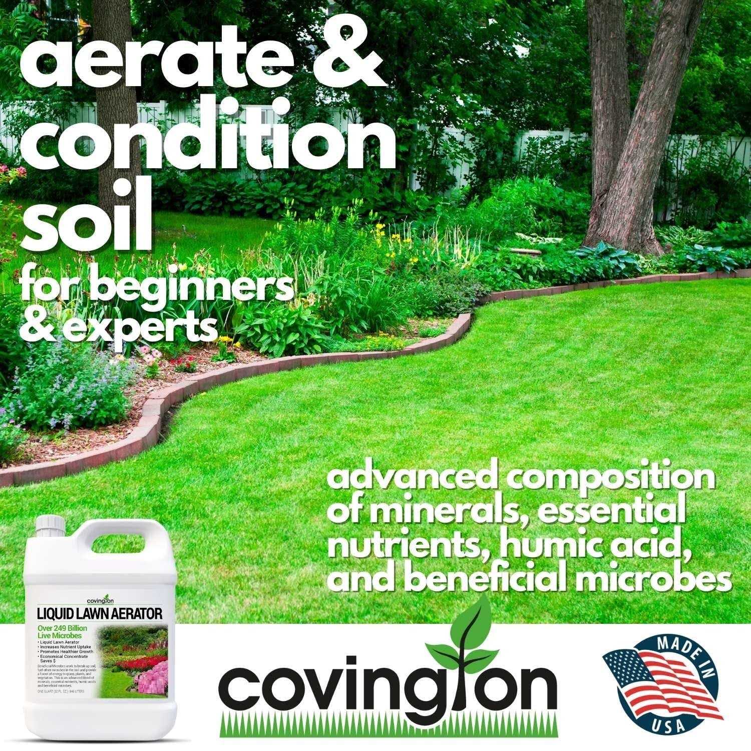 Product Overview Covington Liquid Lawn Aerator is an affordable and powerful biological that alleviates the effects of compaction, increases nutrient uptake and promotes healthier plant growth. This liquid product contains carbohydrates to fuel the microbes, as well as provide an extra energy boost to the plants. Liquid biological that contains a synergistic blend of four bacillus strains of bacteria Alleviates the effects of compaction Increases nutrient uptake and promotes healthier plant growth Advanced composition of minerals, essential nutrients, humic acids, and beneficial microbes. Application Rate Apply 32 ounces per 12,000 sq. ft. depending on the condition of your soil.