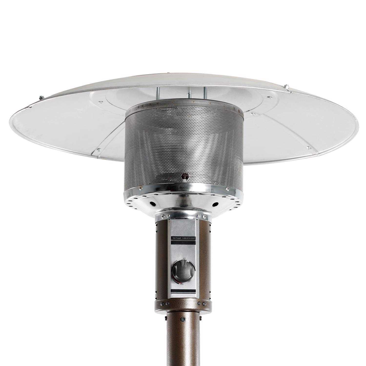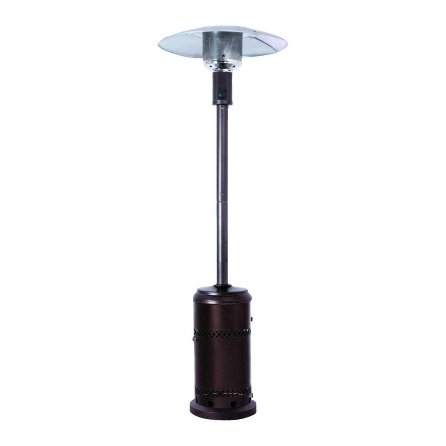 The Living Accents Freestanding 48000 BTU Bronze LP Gas Patio Heater provides warmth to your outdoor areas on cool nights. It has a high efficiency burner system that can provide heat up to a 9 foot radius. It has a high efficiency burner system that can provide heat up to a 9 foot radius. It comes with a flame failure device and anti-tilt switch and is equipped with a piezo electric push and turn igniter for quick and easy starting. The adjustable heat control knob to allow for the perfect temperature adjustment for your ultimate comfort.
