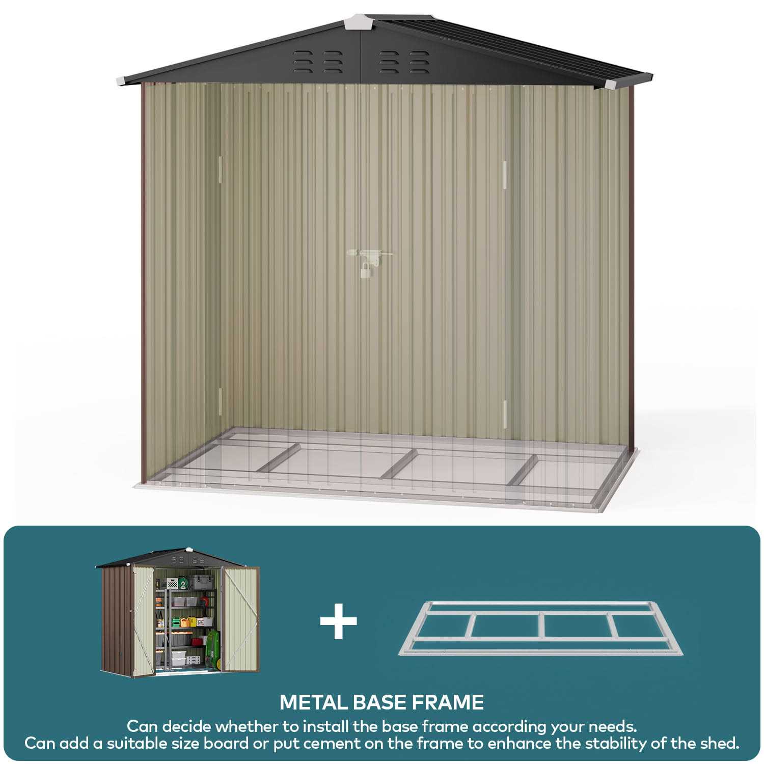 Lofka Brown Outdoor Shed for Storage on Patio, Garden, Backyard —Ideal Choice for Storing Outdoor This outdoor storage shed is perfect for those looking for a durable and secure option for storing their outdoor tools and equipment. Featuring a sturdy metal frame and double lockable doors, this shed provides excellent protection against theft and weather damage. The shed is made of galvanized metal, making it weather-resistant and durable against harsh outdoor conditions. The metal base frame adds extra stability and protection against ground moisture. Additionally, this shed offers versatility, serving not only as a storage cabinet but also as a pet house. The shed is easy to assemble, making it an excellent option for those who prefer to do things themselves. The shed features a brown color that blends well with the outdoors and adds a touch of sophistication to your outdoor space. Whether you need to store gardening tools, outdoor equipment, or pet supplies, this outdoor storage shed is a perfect choice.