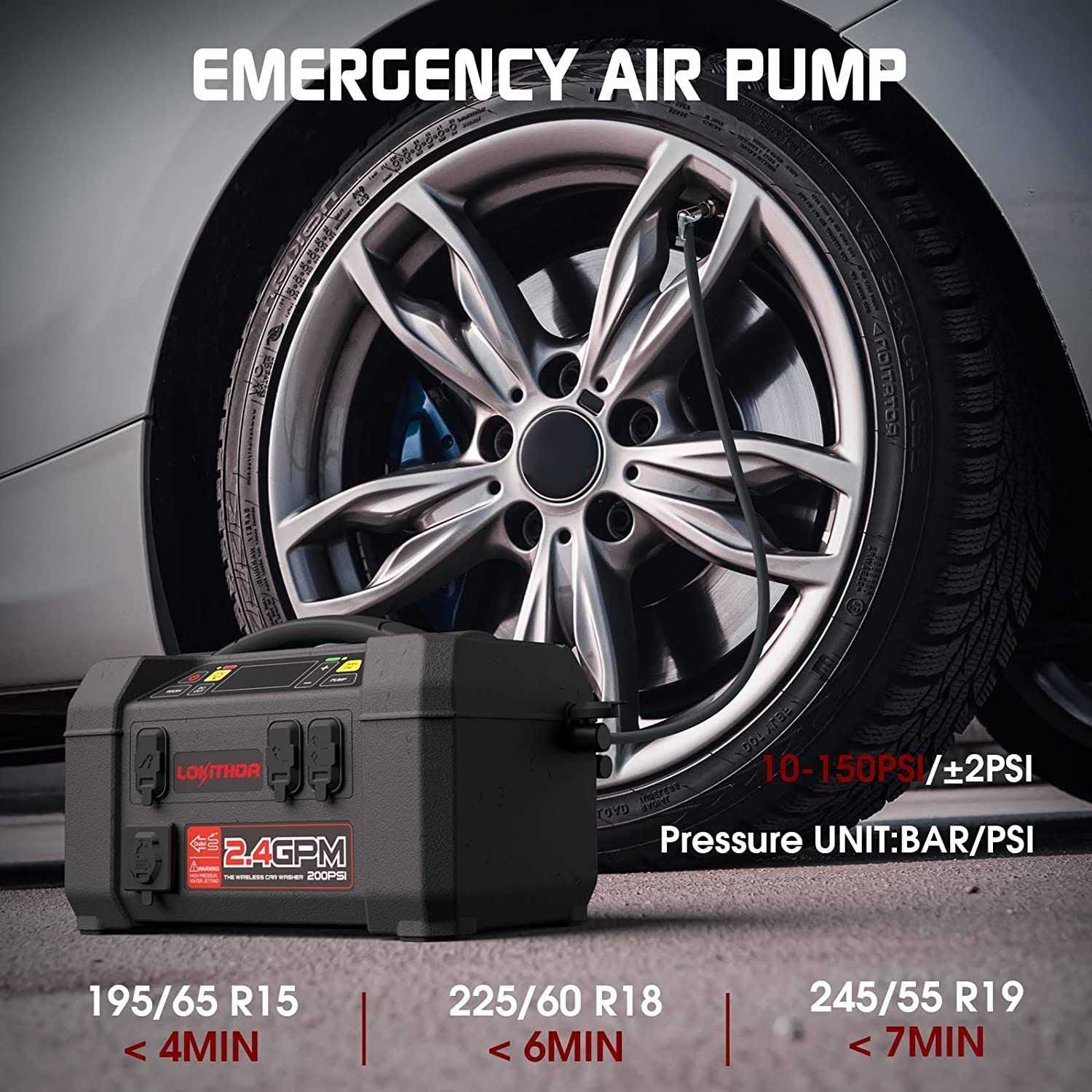 2500A Jump Starter1.5 MPA Cordless Portable Pressure Washer150PSI Tire Inflator500-lumen LED flashlightExternal Power Supply60W Two-way Fast Charging [“HIGH PERFORMANCE DRIVEN AW401 battery jump starter has supper starting current 2500A, after full charge can achieve 60 times jump-start. Suitable for gasoline engines under 8.5 liters and diesel engines under 6.5 liters, including: Cars, Motorcycles, Boats, RVs, ATVs, SUVs, Vans, Tractors, Mowers and more., CORDLESS PRESSURE WASHER Portable AW401 Car Washer has up to 200 PSI pressure, perfect for quick cleanups in campgrounds, cabins, cars, beaches and boats or anywhere electricity is at a premium, built in Toss (total stop system), automatically shuts off pump when trigger is not engaged to save energy and prolong pump life. 20000mAh portable power bank, battery life up to 40 minutes., 60W TWO-WAY FAST CHARGING AW401 jump pack Completely input recharges in just 1.6 hours, or Start your car in just 5-minutes of charge. Its internal power bank provides 60W of power output – easily powering your USB-C devices such as phones, tablets, laptops, wearables and more., EMERGENCY AIR PUMP AW401 digital air pump is manufactured with the unique Turbocharged Movement, which is more powerful, more stable and less noisy. It can provide maximum pressure of 150 PSI and airflow of 35L/Min, supports tire-pressure detection, Preset values stopping and unit switching (BAR/PSI). Only need 5 mins to fully Inflating the 195/65/R15 car tire from 0 to 35 PSI. Professionally calibrated to always about the Digital-display within 1.0% of the pressure of tire., ULTIMATE SAFETY AND MULTI-FUNCTION AW401 has the function of forced start of dead car, safe and spark-free operation. 10+ protections to instantly start your car’s engine. Mistake-proof design with reverse polarity and spark-proof technology. In addition, the integrated 500-lumen LED flashlight(Flashlight; Strobe; SOS), Light up the night and keep you away from danger. Jump Starter Peak Amps: AW401-2500A, Air Compressor: 150PSI-35L/Min, Power Bank: 74Wh, LED Flashlight: 500 Lumens, Engine Rating: 8.5L Gas / 6.5L Diesel, Dimensions LxWxH: 10.12 x 5.91 x 6.18 inches, Battery Cell Composition: Lithium Polymer, Voltage: 12 Volts, Battery Capacity: 20000 Milliamp Hours, Fast Charging: 60W Two-way, Weight: 2.35”][]