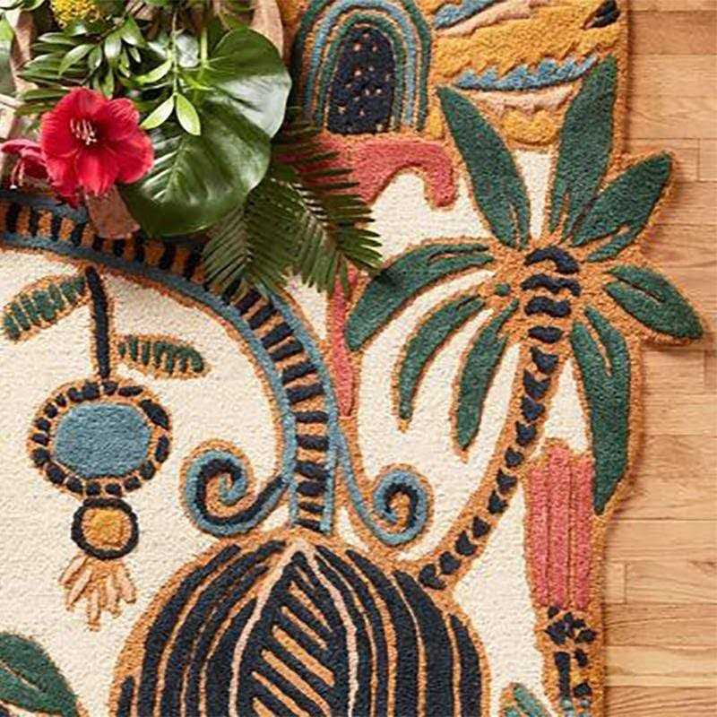 Fans of fun, global decor are sure to fall in love with this stunning Optimism OPT-03 area rug from Justina Blakeney x Loloi. The Optimism collection is designed uniquely Justina Blakeney, with artistic tropical motifs and exciting shapes, bringing life into today’s homes. The Optimism OPT-03 area rug features an illustrative tropical design in two versatile colorways. In addition, it has a unique border shape with an eye-catching pattern, making it ideal for adding a hint of fun to your favorite room. This area rug is meticulously handcrafted by skilled artisans in India. It has a plush 1/2″ wool pile that feels soft underfoot, and it’s pet- and kid-friendly. Note that wool area rugs shed when new because of how the yarn is spun. Thankfully, you can control the shedding until it subsides by vacuuming as often as you need with the beater bar off. Keep your rug clean by blotting messes as soon as possible. For deeper stains and grime, schedule periodic professional cleanings.