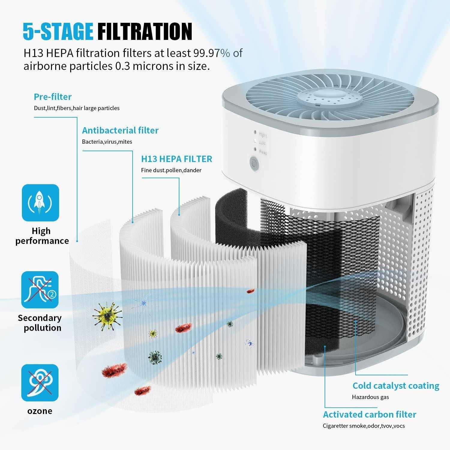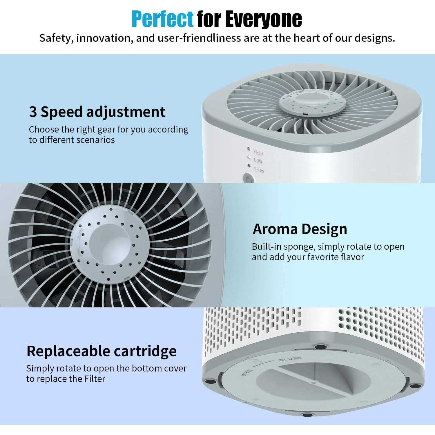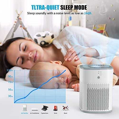 High Efficiency Air Purification System: Using HEPA active carbon filter, can capture 99.97% of 0.3 microns in size, such as PM2.5. Air Circulation Rate Full Coverage: The design of the air purifier features 360 air intake, that will be faster to refresh the air in your room. The refresh rate is 5 times per hour than the regular one. Mighty with large purification area covered is suitable for an area of 302 sq. Sleep Model at Night: Filtering the air with lowest noise level of 24 db is perfect for restful and soothing indoor environment, which is helpful to sleep deeply. Air purifiers for home large room the light is not strong at night, which will not bring you any discomfort while sleeping. More care for mother, baby and children. Portable Air Purifier: Easily take this small air purifier to anywhere, office, living room, bedroom, even traveling , what you require is just an adapter. Always have fresh air around you, keep your life healthy.