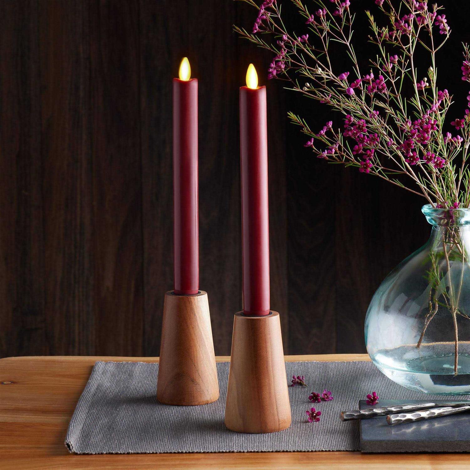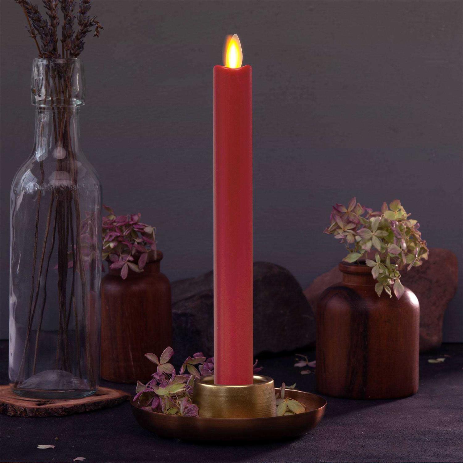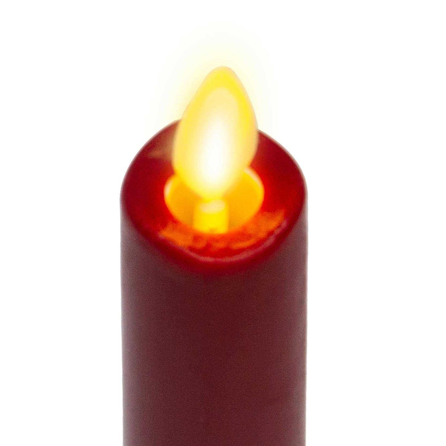 The real flame-effect technology highlights the bold red hue and smooth paraffin wax. If you’re having a romantic dinner, place these candles in the center of the table to set the tone for the evening. Luminara Flameless LED Moving Flame Tapers are made with 100% pure paraffin wax, hand poured and carefully designed to look like traditional candles. They are safer to use than traditional candles, since no actual combustion or wax consumption happens. That means no soot or chemicals are released into the air, making them perfect for use indoors. They’re perfect for households with small curious children and rambunctious pets.Single LED Taper 1” wide x 9.7” tall made of real wax The light is a warm white color encased in a yellow flame designed to be as realistic as possible. It automatically flickers when you turn the candle on, increasing the realism. The real paraffin wax is a traditional ivory color. Perfect for year-round use, they will go with just about any décor style. The candles take 2 AA batteries, and provide 200 hours of runtime. Batteries are not included. When using the timer function, the candle will light up for 5 hours, and then automatically shut off for 19 hours. With proper care, these flameless candles will provide years of lovely, safe illumination. Candles come packaged in sturdy boxes to protect them during the process. They also are easy to wrap without having to search for just the right shaped box. They make excellent presents for any occasion–Christmas, birthdays, Mother’s Day, party hostess gifts, or even for yourself! These elegant candles with a scalloped top suit weddings, formal get-togethers, holiday dinners and graduation parties.