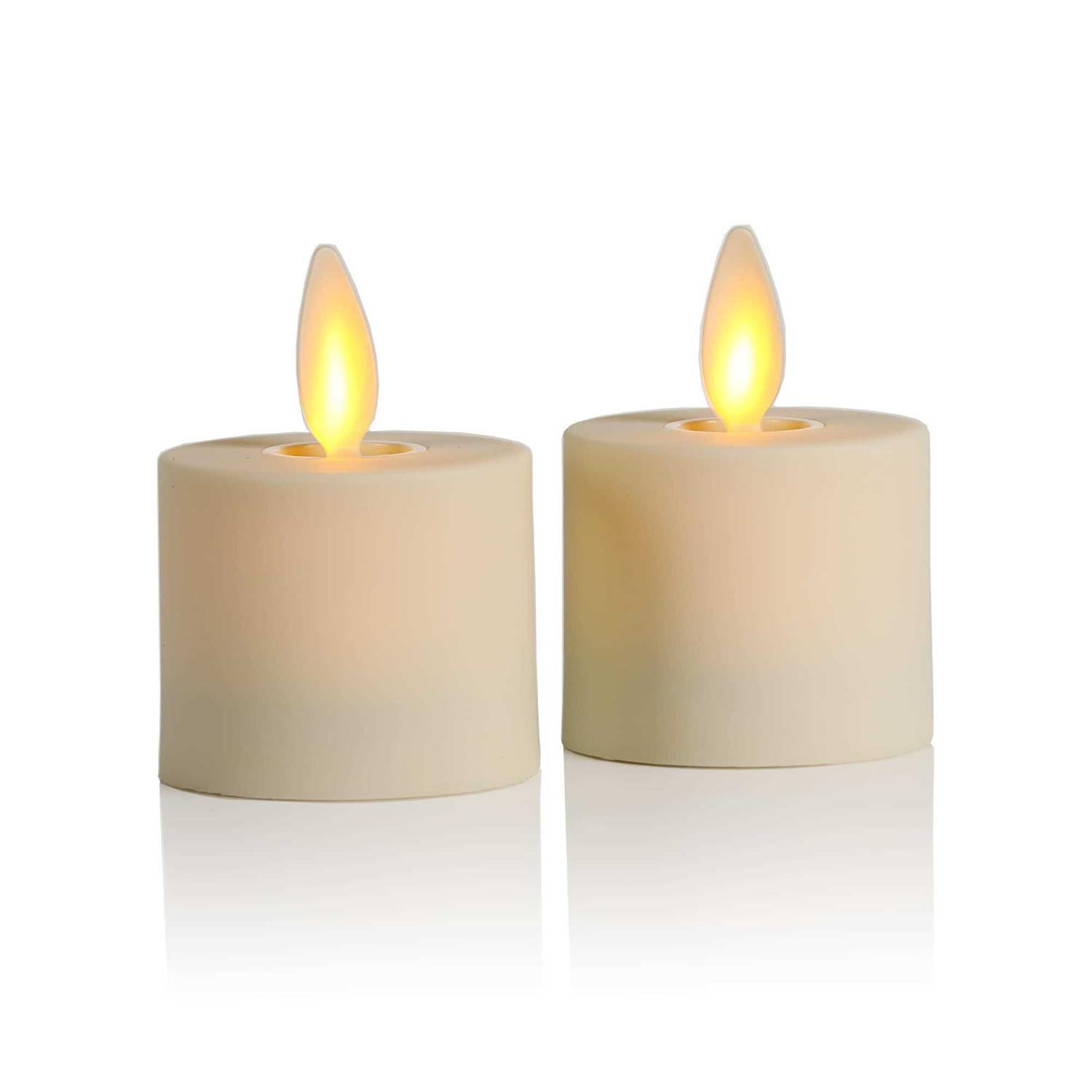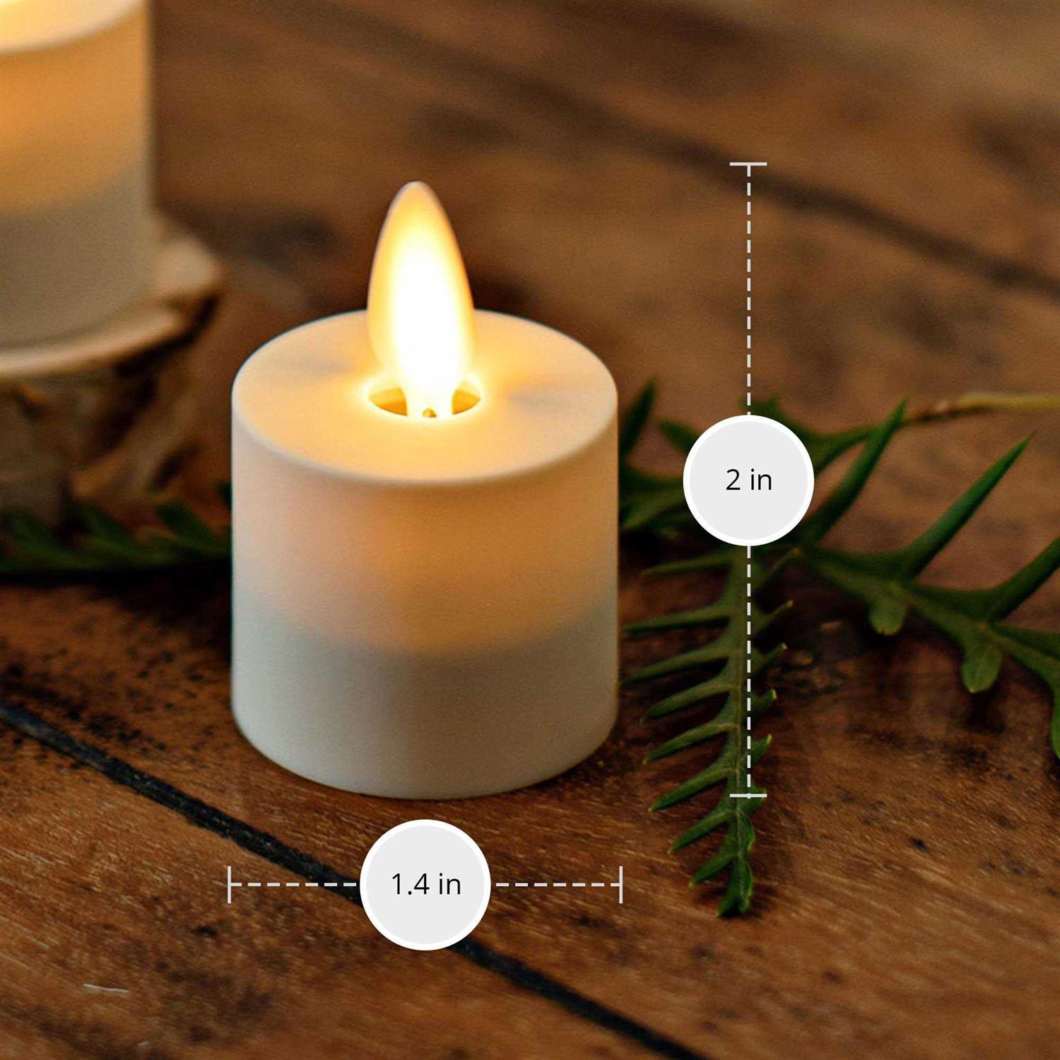 Accent your décor with candlelit charm without the risk of an open flame! They’re great for mixing with pine garlands and centerpieces, giving you a woodsy Christmas glow without the fire hazards. They can be operated with a remote (remote ready), which is sold separately. They also can be turned on and off using the switch on the bottom of each candle. The Real-Flame Effect of these mini LED lights lets you use them in places where real live flame candles are not recommended. Set near or drape with light gauzy fabric to create a romantic or spooky atmosphere. Tuck them into Christmas greenery, both real and artificial. These short candles are not designed to be waterproof, so it is advised to bring them in out of the rain, or keep away from floating displays. Each candle uses 1 CR2450 button battery, which will give you 50 hours total runtime before needing to be replaced. When used with the automatic timer, you’ll only have to replace the batteries a few times during the whole holiday season, from Halloween to New Year’s. That makes these votive candles a beautiful decorating choice that is easy on the wallet for long-term use. Each little battery operated candle measures 1.4″ x 2″ (measured to the top of the flame). That’s just enough to give you lots of lovely illumination without requiring a huge amount of space. The patented moving flame casts a flickering glow against the high-quality plastic. Place your candles in votives or glass jars to capture the look of traditional candles without the open flame.