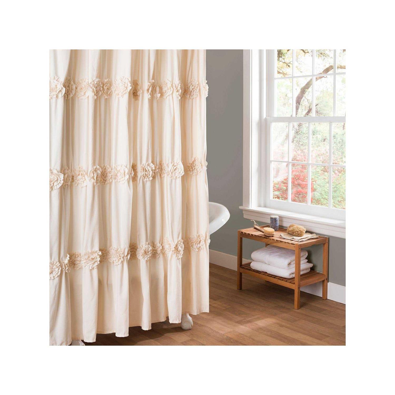 - With details such as ruching and crafted flowers this is a curtain that can change the whole look of your bathroom without overwhelming it.