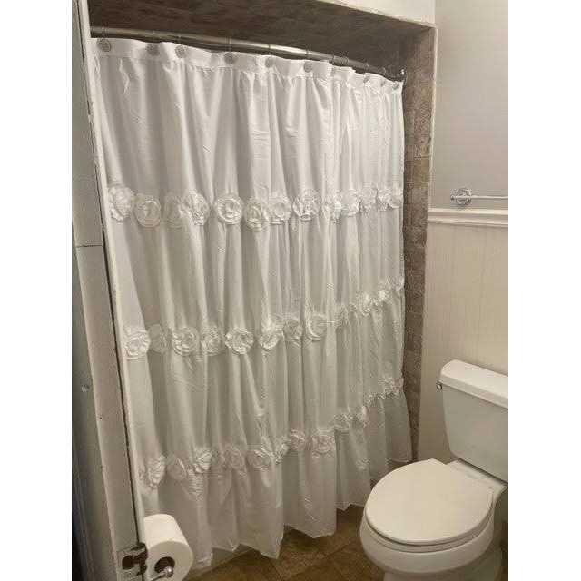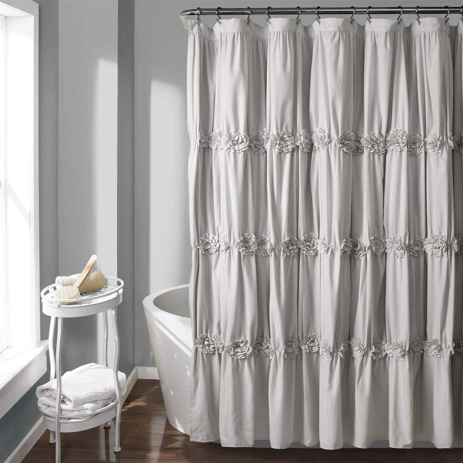 - With details such as ruching and crafted flowers this is a curtain that can change the whole look of your bathroom without overwhelming it.